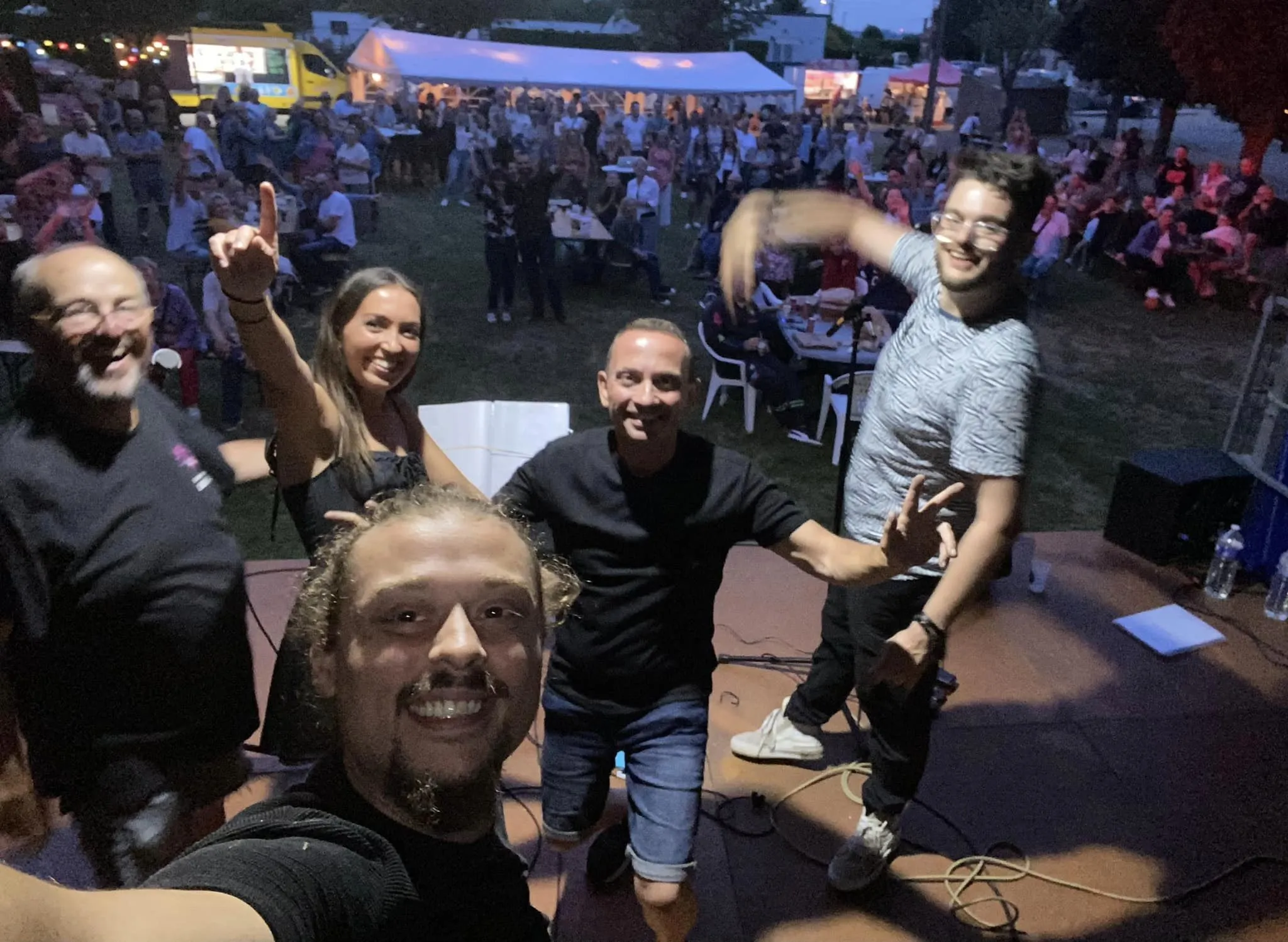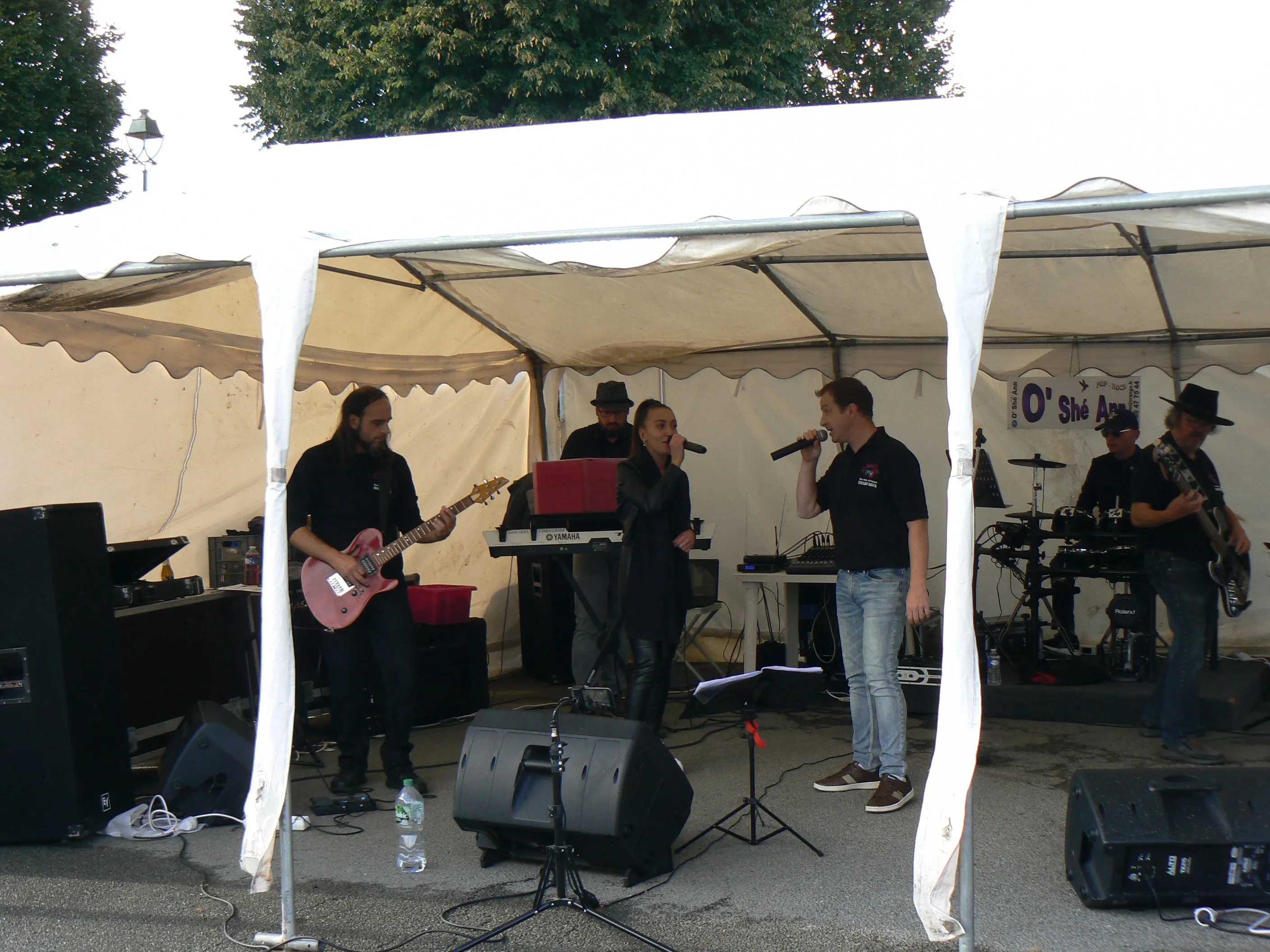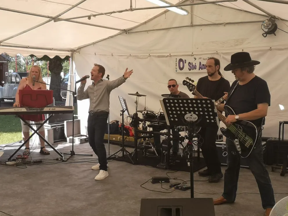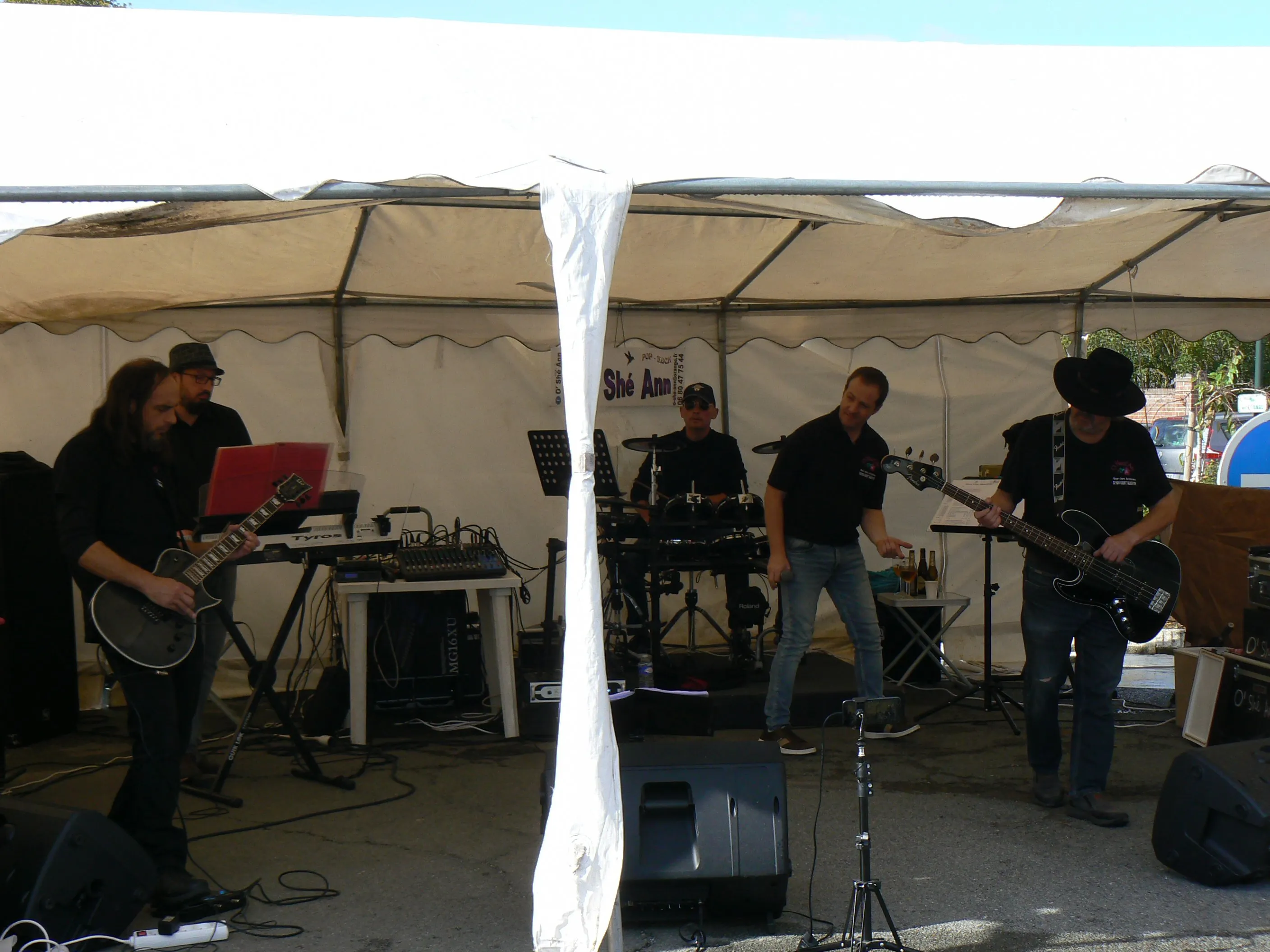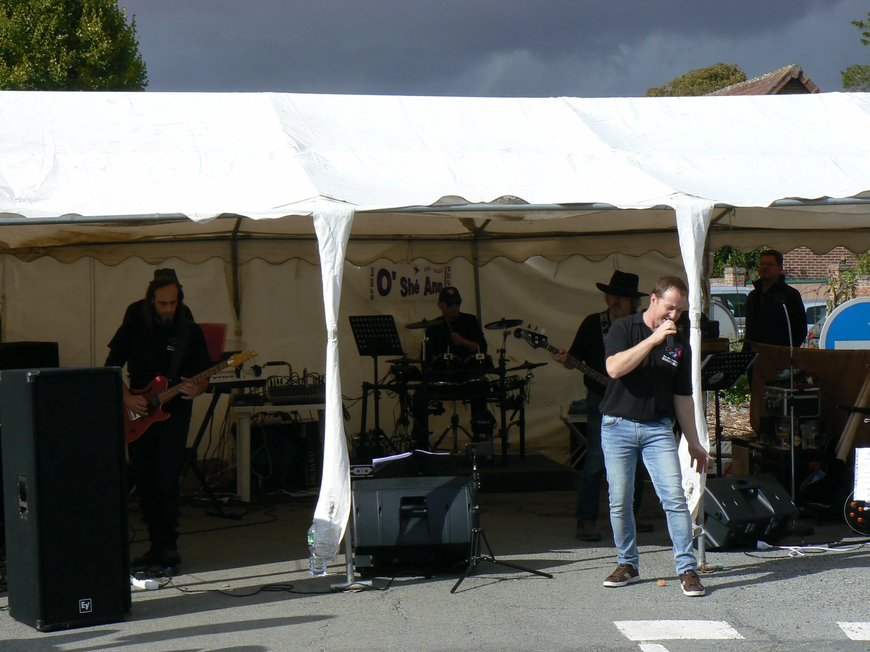 Le public cherche à se mettre à l’abri où il peut : qui dans la salle des fêtes, qui sous les barnums, y compris celui qui abrite le groupe, et c’est « serrés comme des sardines » que les musiciens terminent le concert dans une ambiance survoltée sur des airs de AC/DC ou encore de Jean Louis AUBERT.