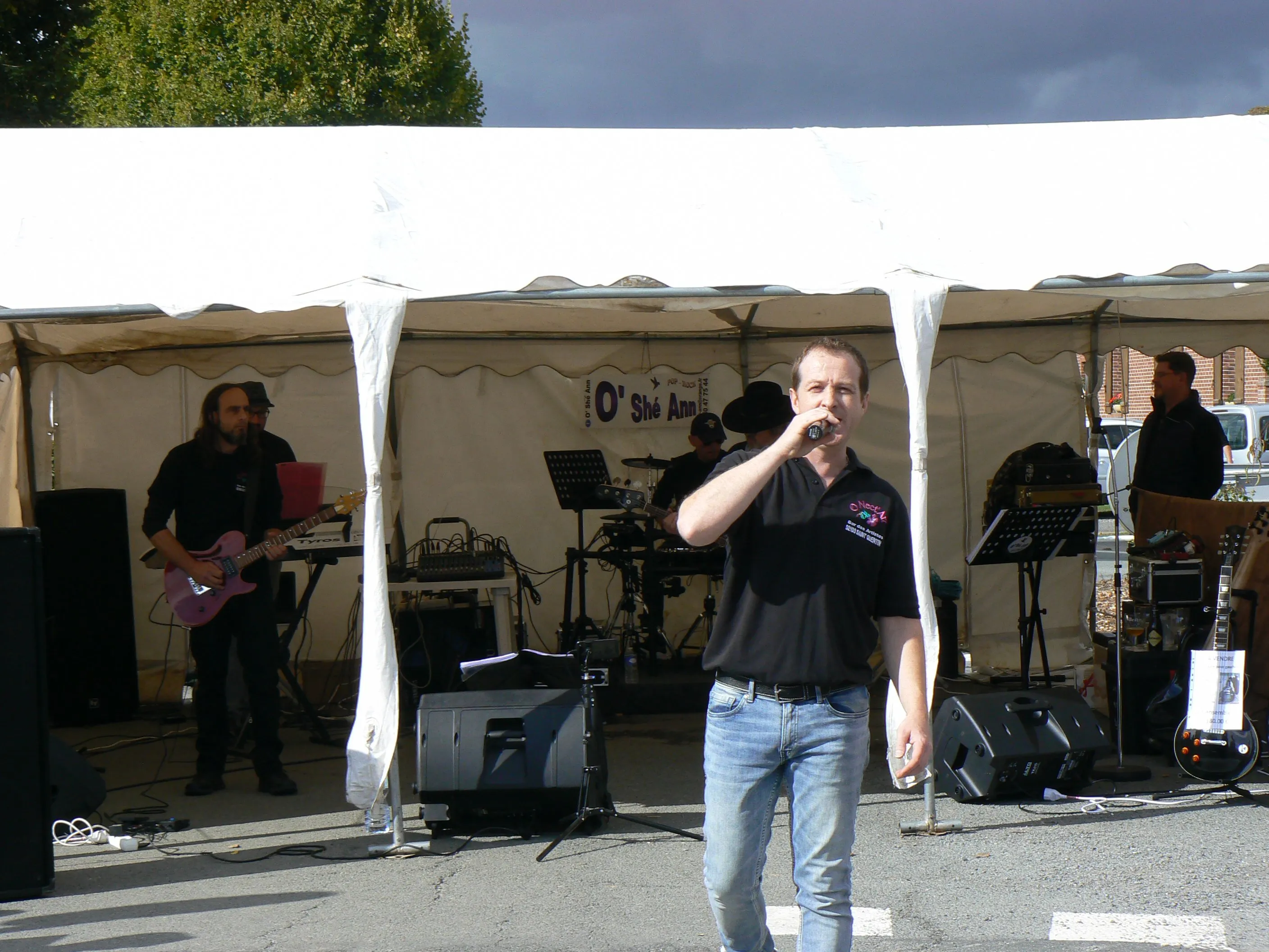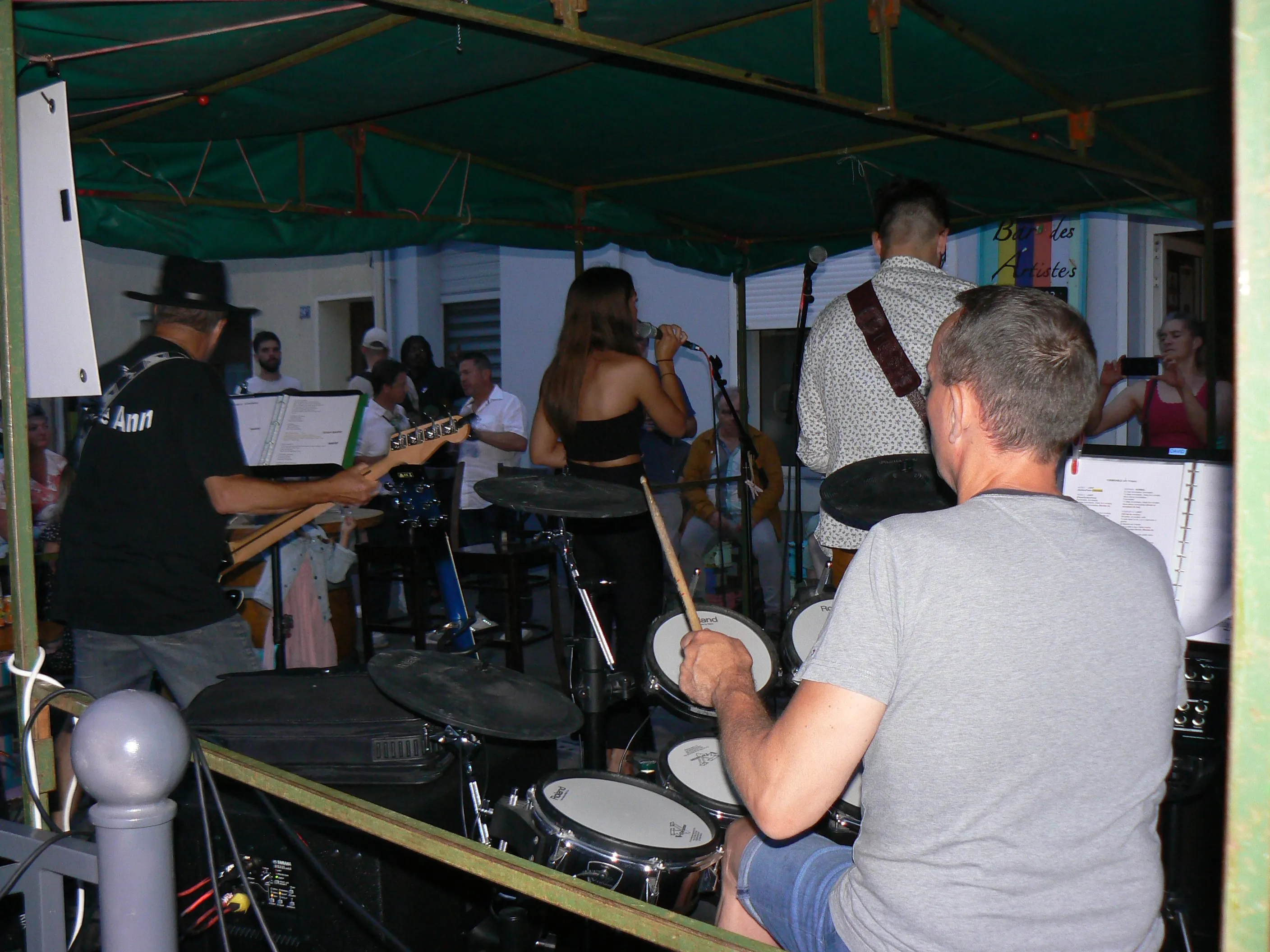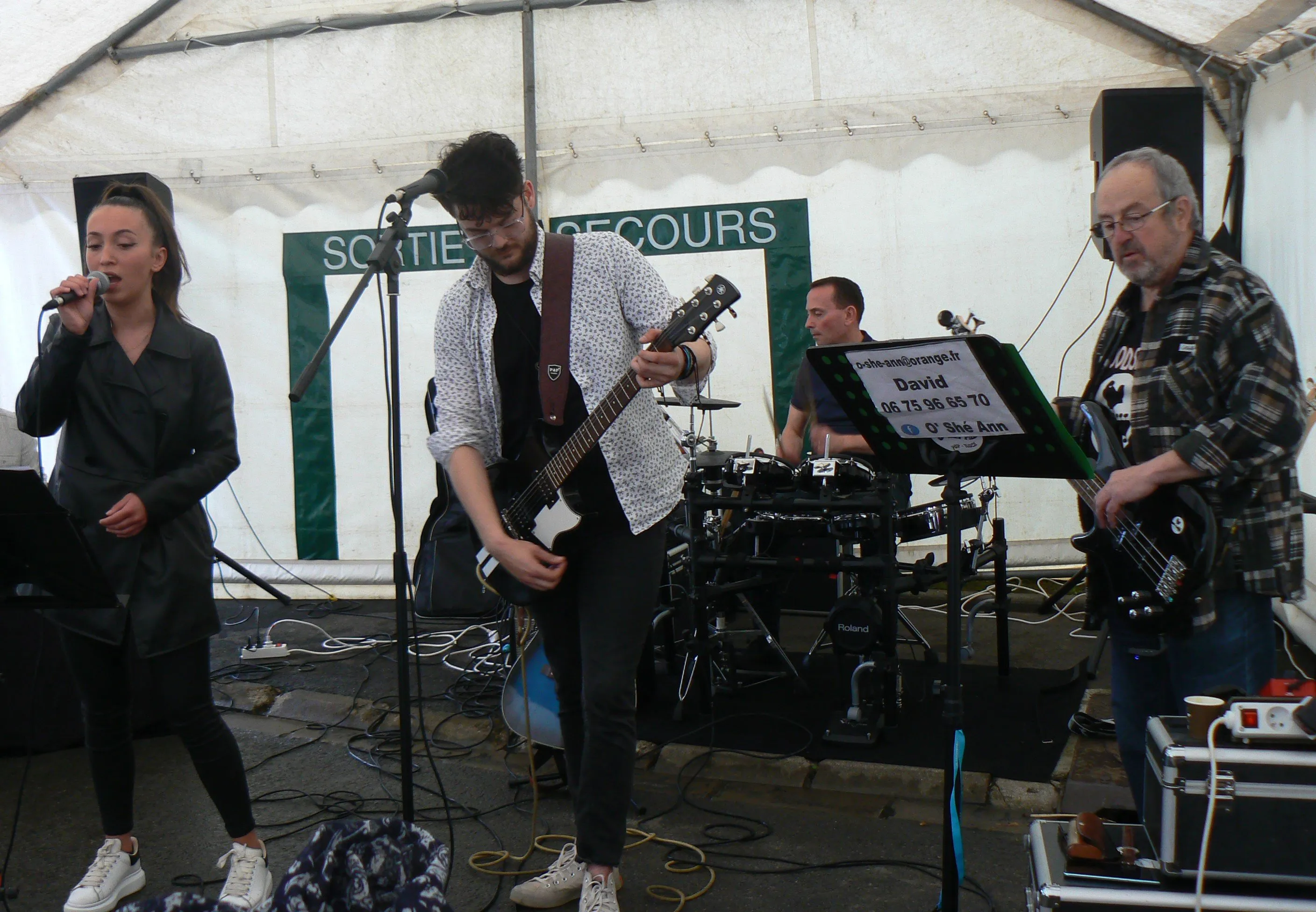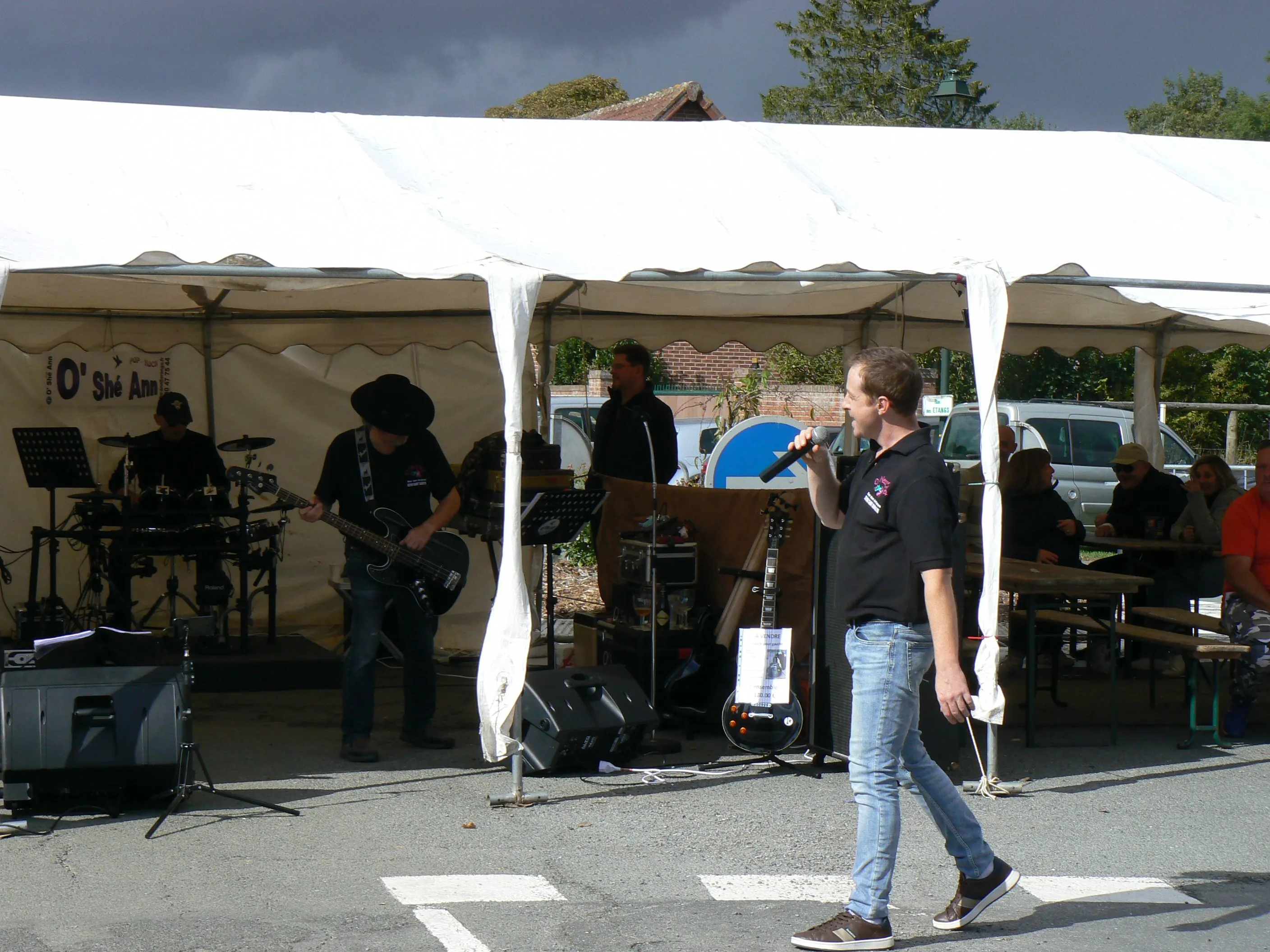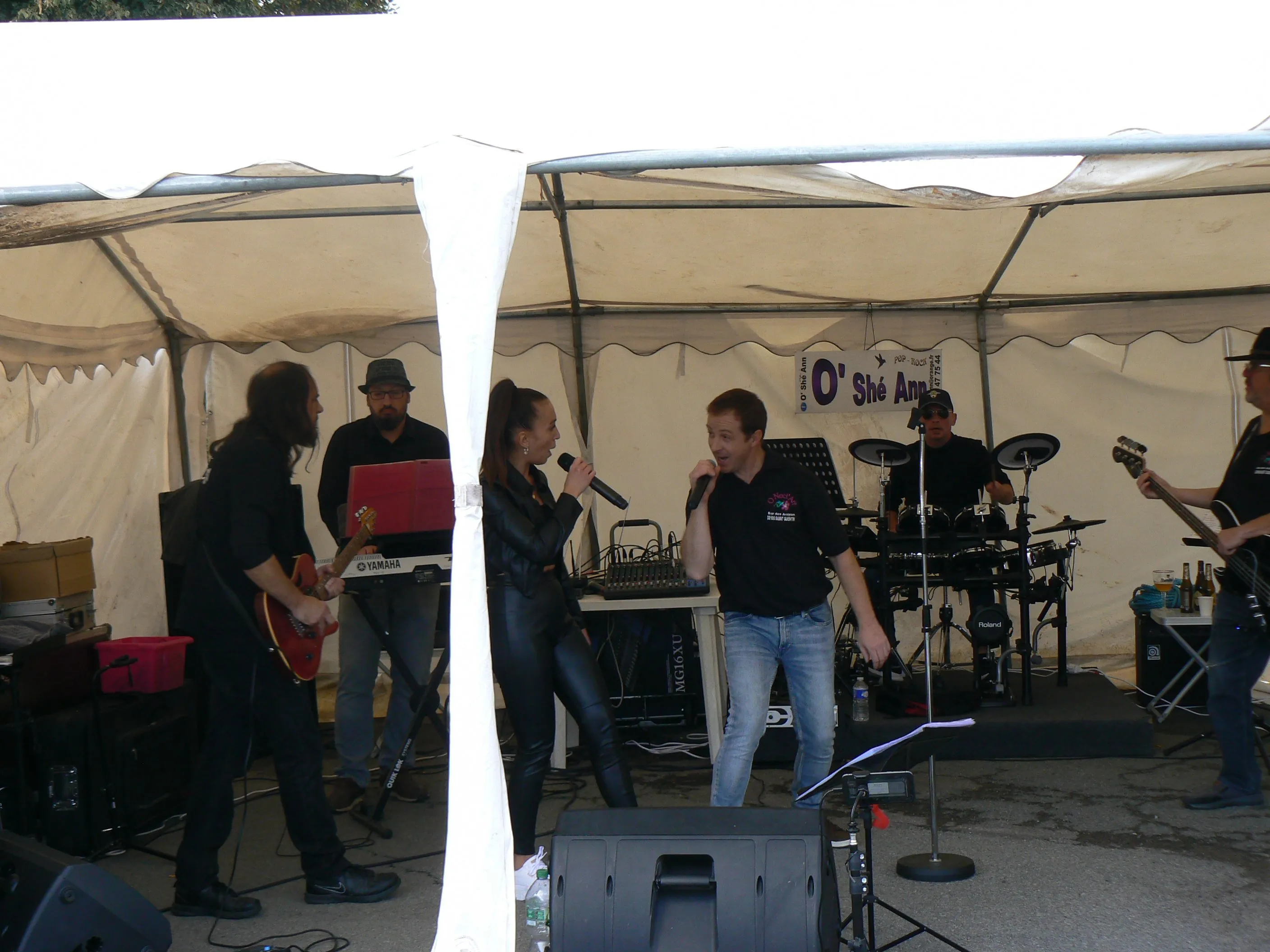 Le public cherche à se mettre à l’abri où il peut : qui dans la salle des fêtes, qui sous les barnums, y compris celui qui abrite le groupe, et c’est « serrés comme des sardines » que les musiciens terminent le concert dans une ambiance survoltée sur des airs de AC/DC ou encore de Jean Louis AUBERT.
