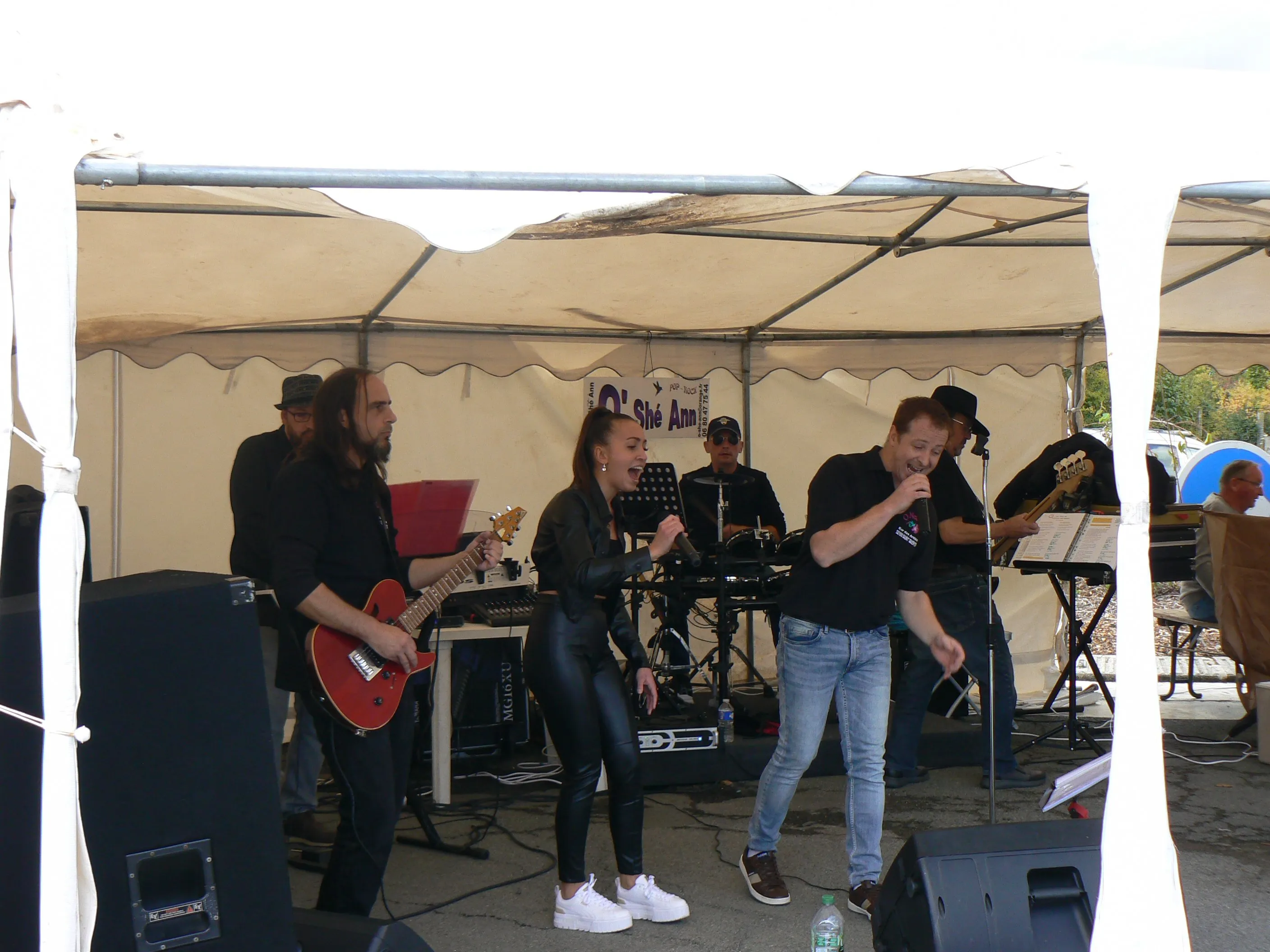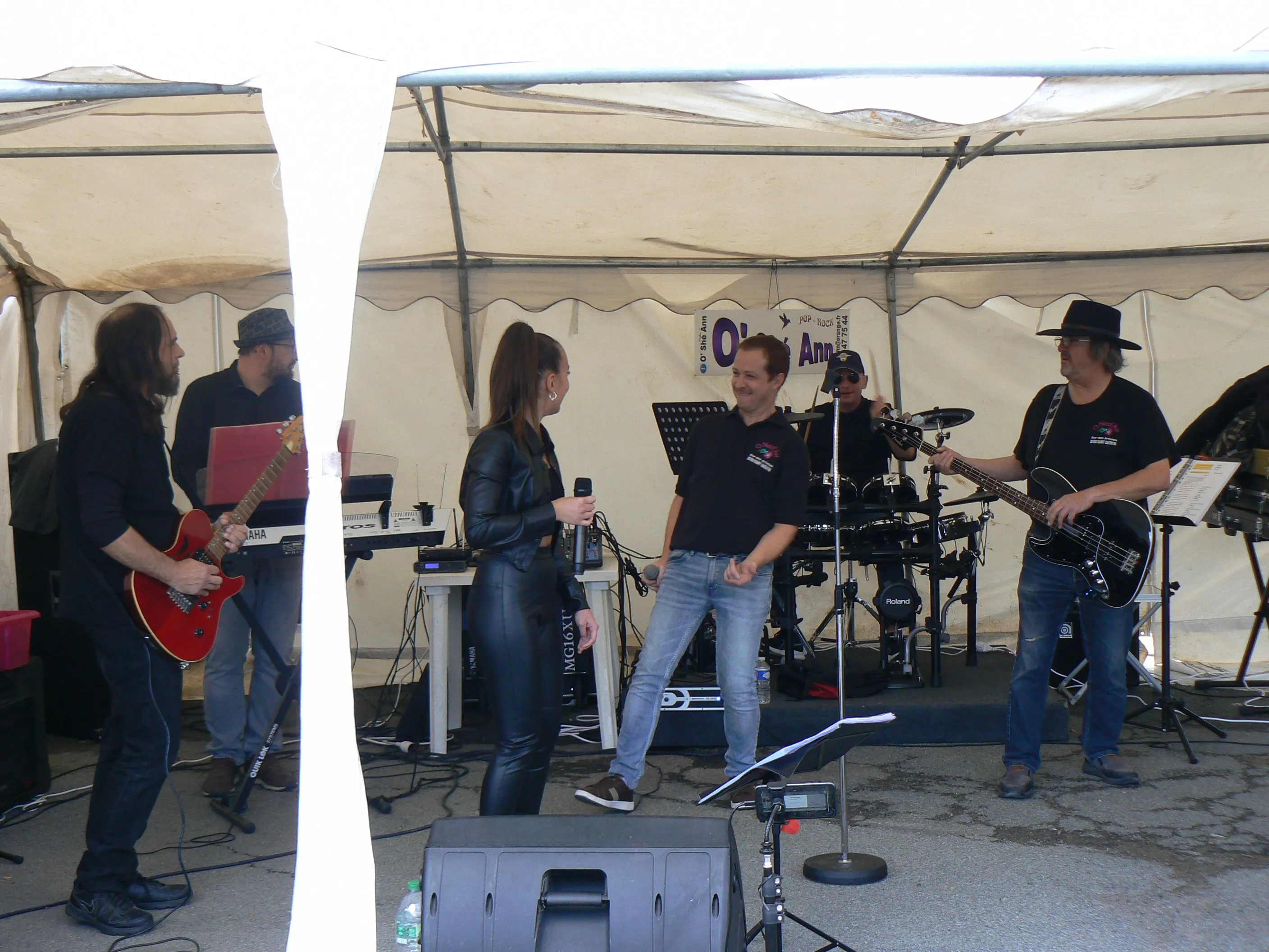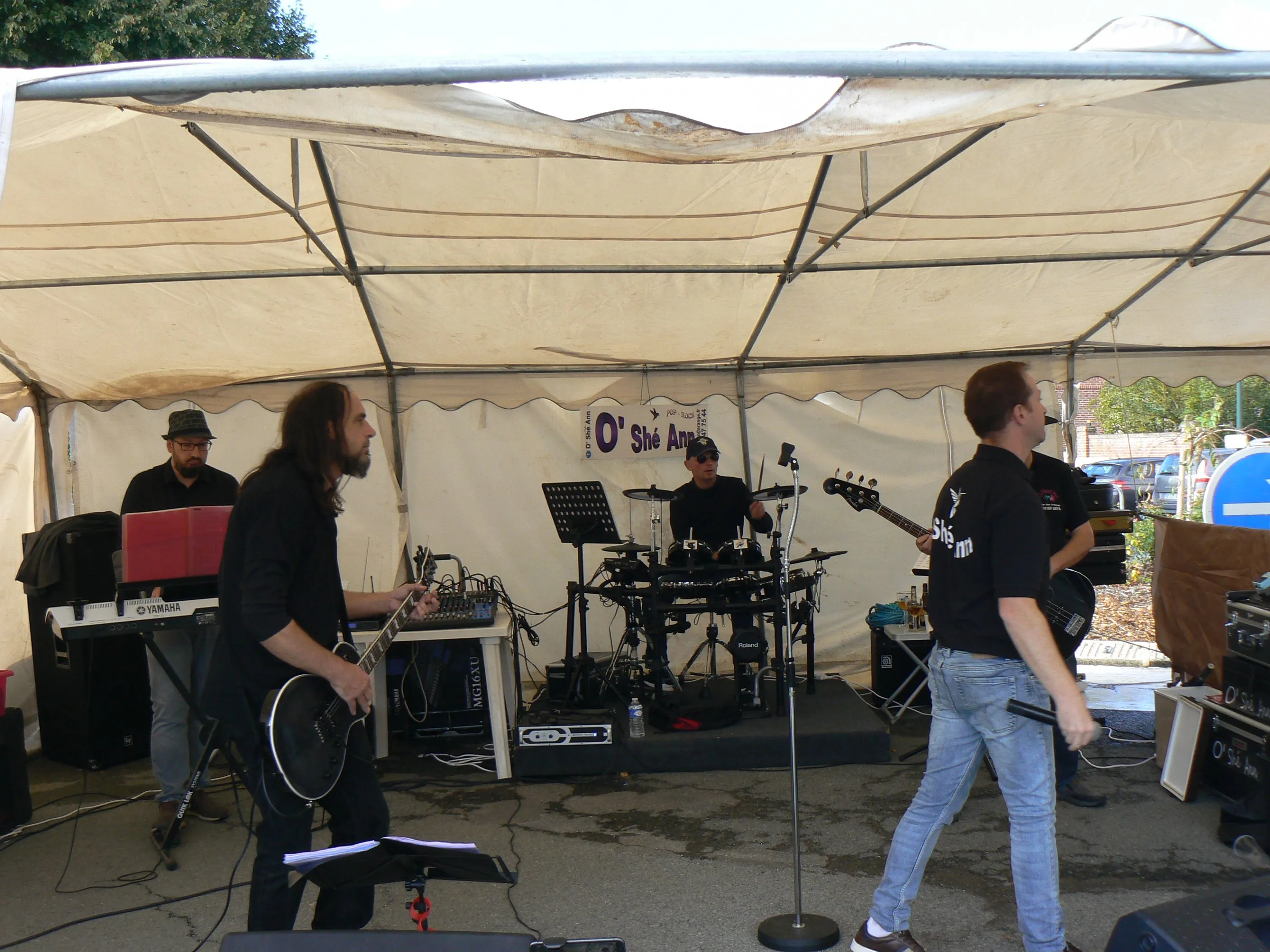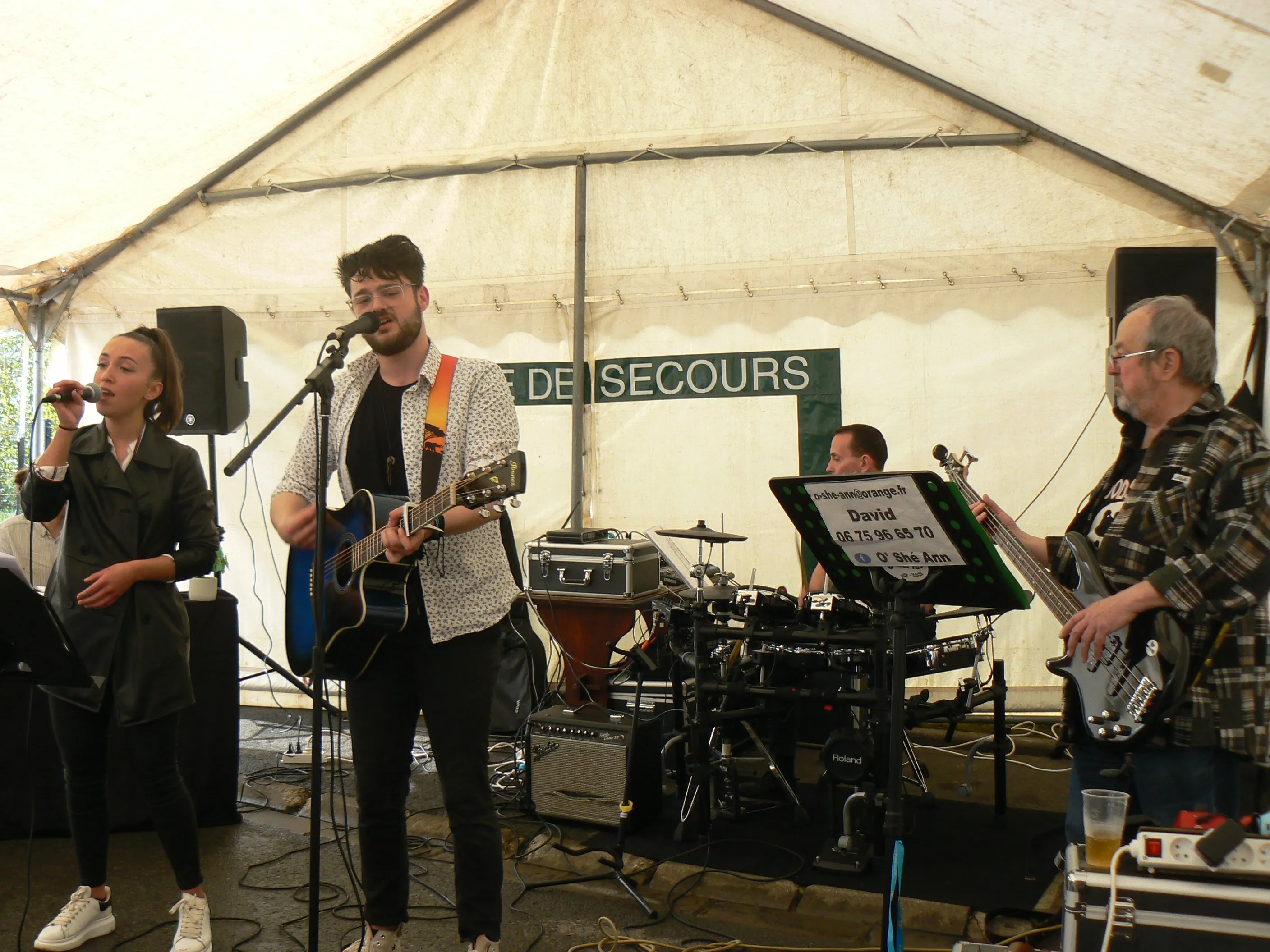 Le public cherche à se mettre à l’abri où il peut : qui dans la salle des fêtes, qui sous les barnums, y compris celui qui abrite le groupe, et c’est « serrés comme des sardines » que les musiciens terminent le concert dans une ambiance survoltée sur des airs de AC/DC ou encore de Jean Louis AUBERT.