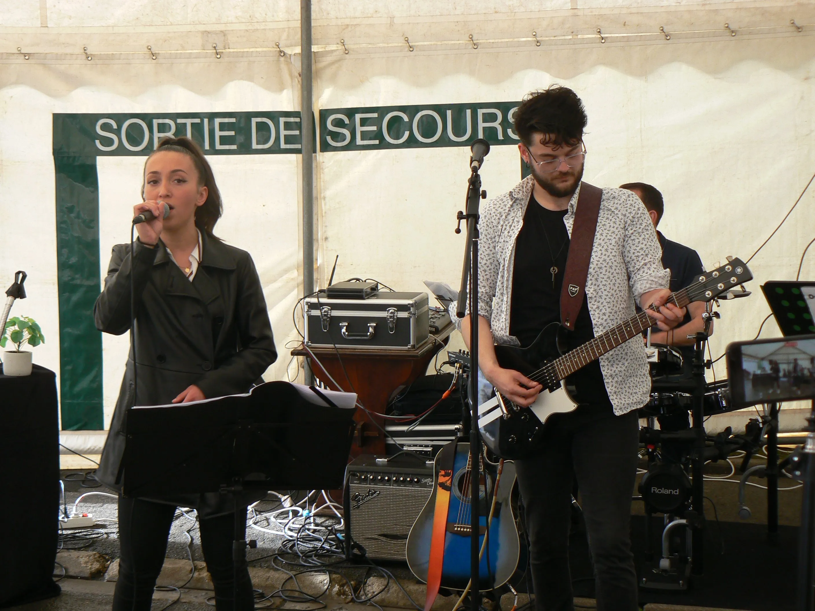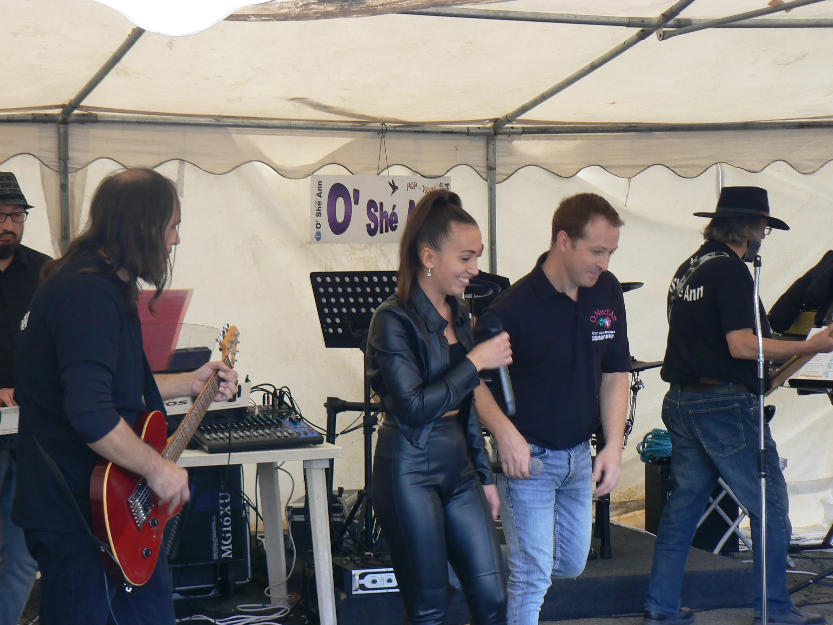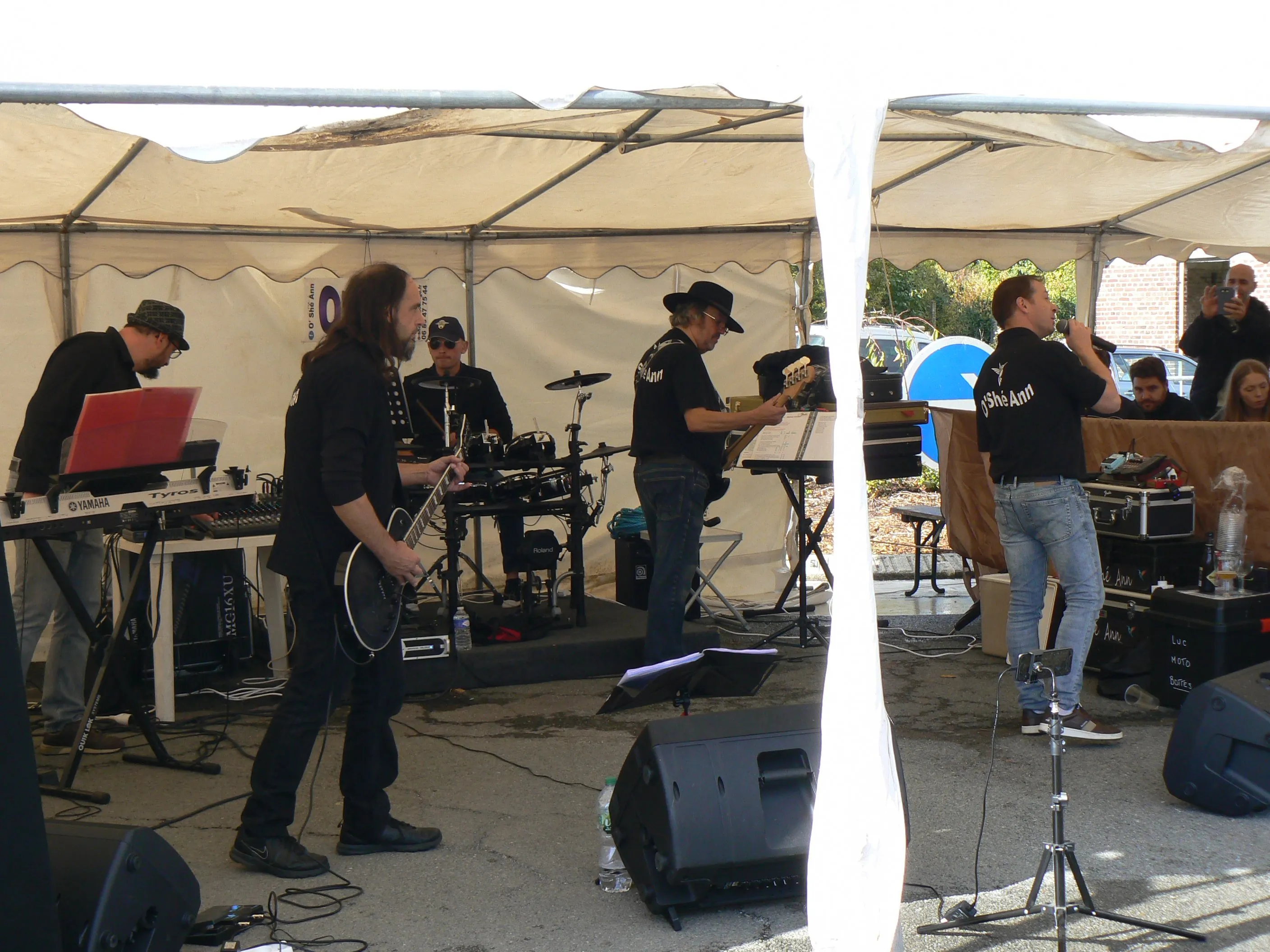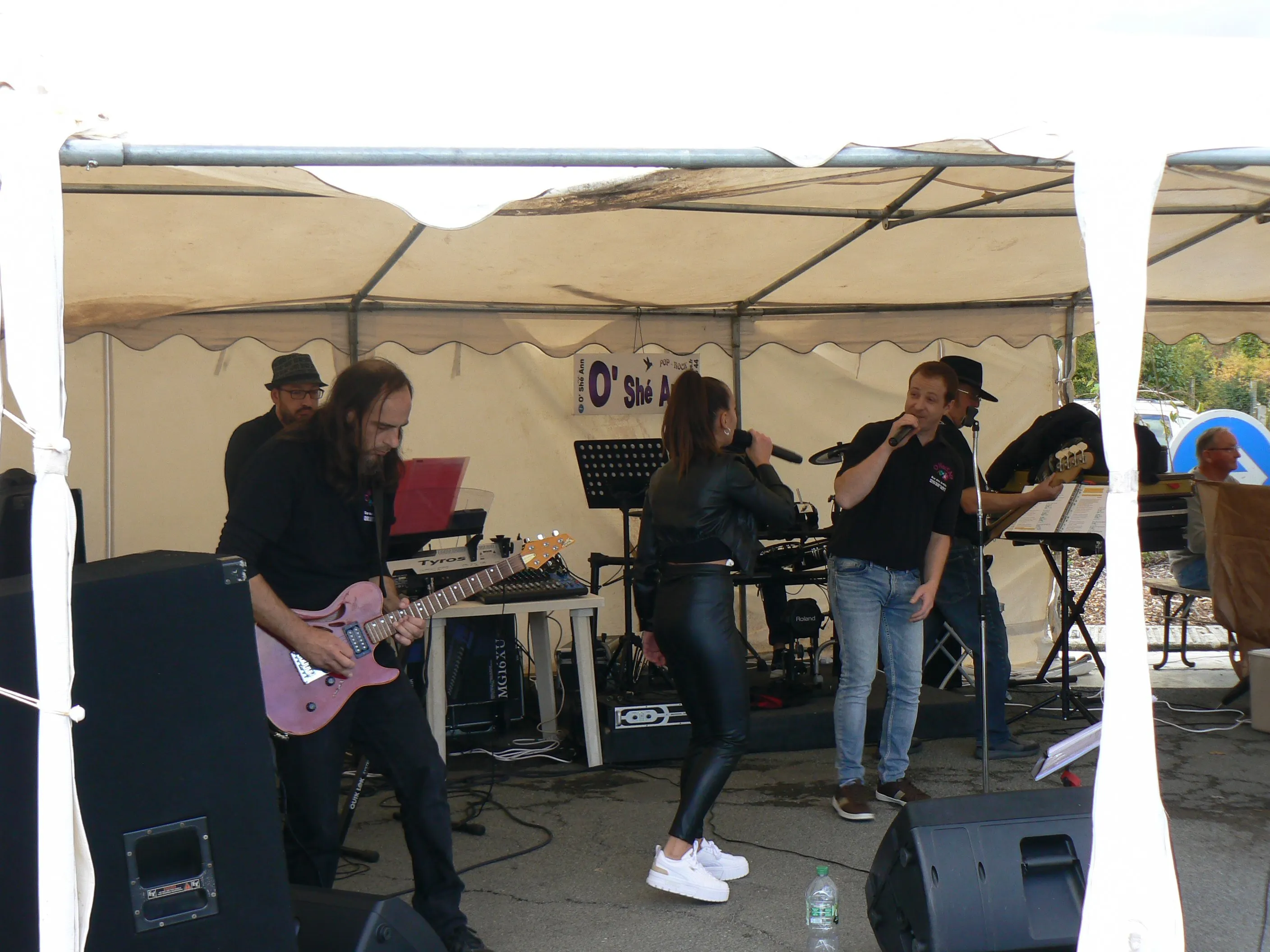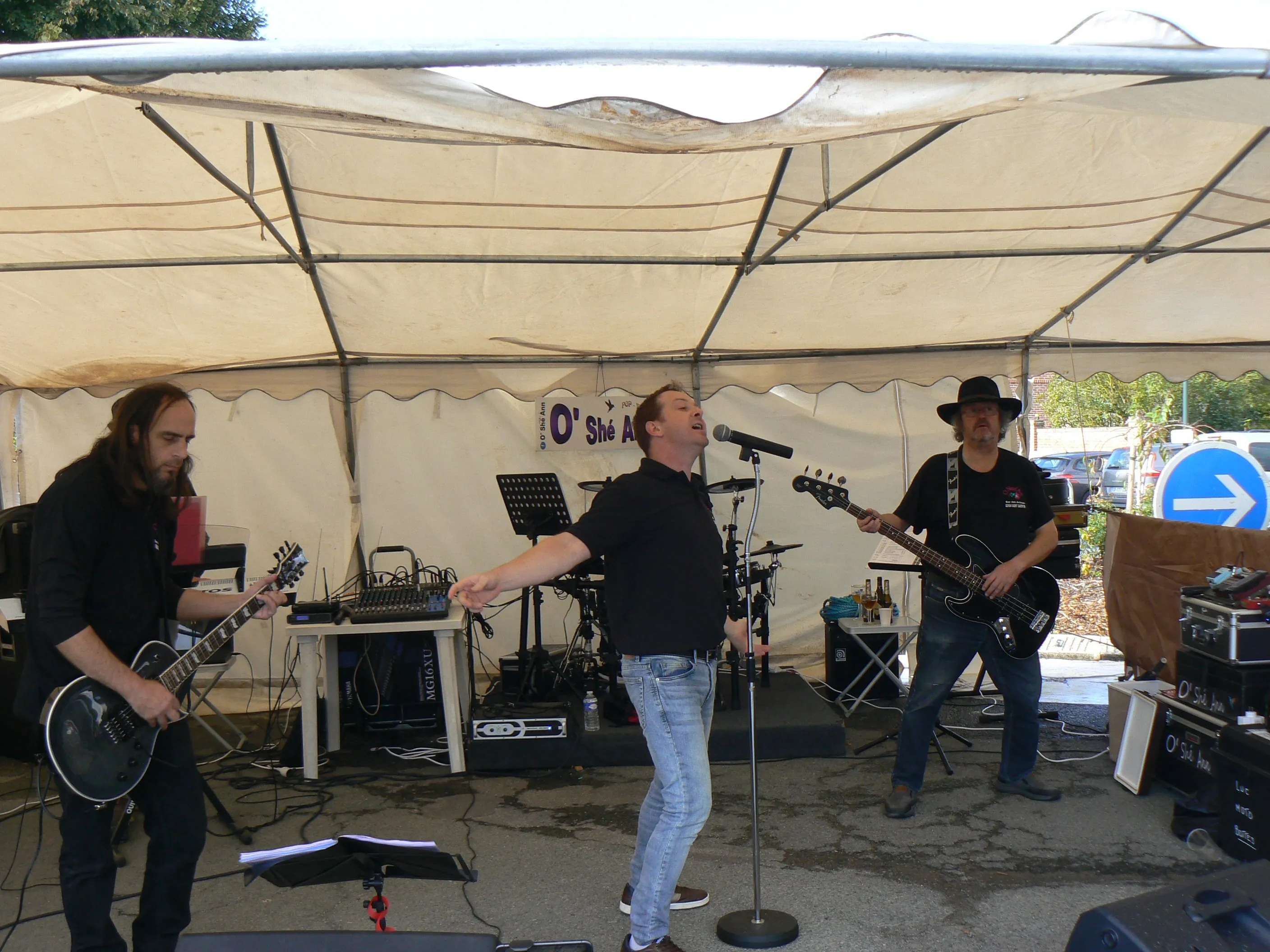 Le public cherche à se mettre à l’abri où il peut : qui dans la salle des fêtes, qui sous les barnums, y compris celui qui abrite le groupe, et c’est « serrés comme des sardines » que les musiciens terminent le concert dans une ambiance survoltée sur des airs de AC/DC ou encore de Jean Louis AUBERT.
