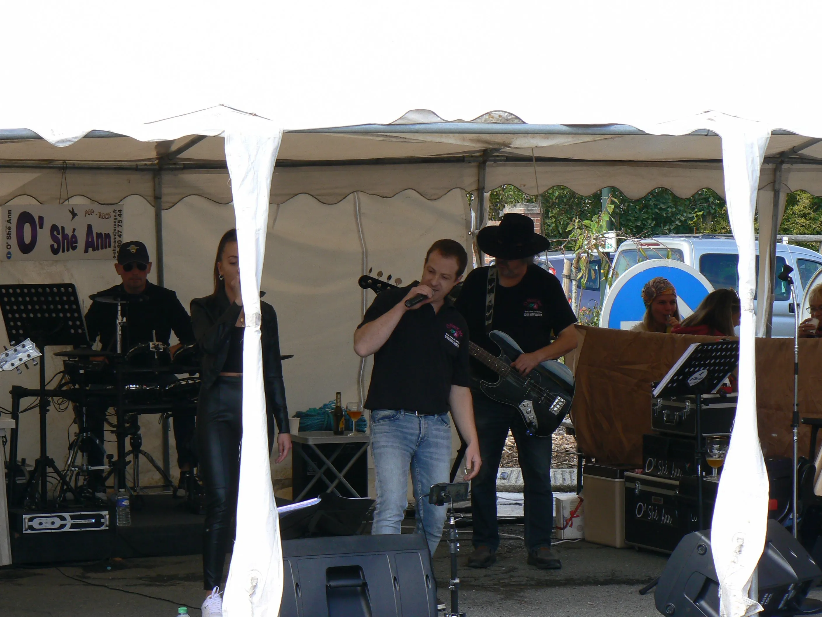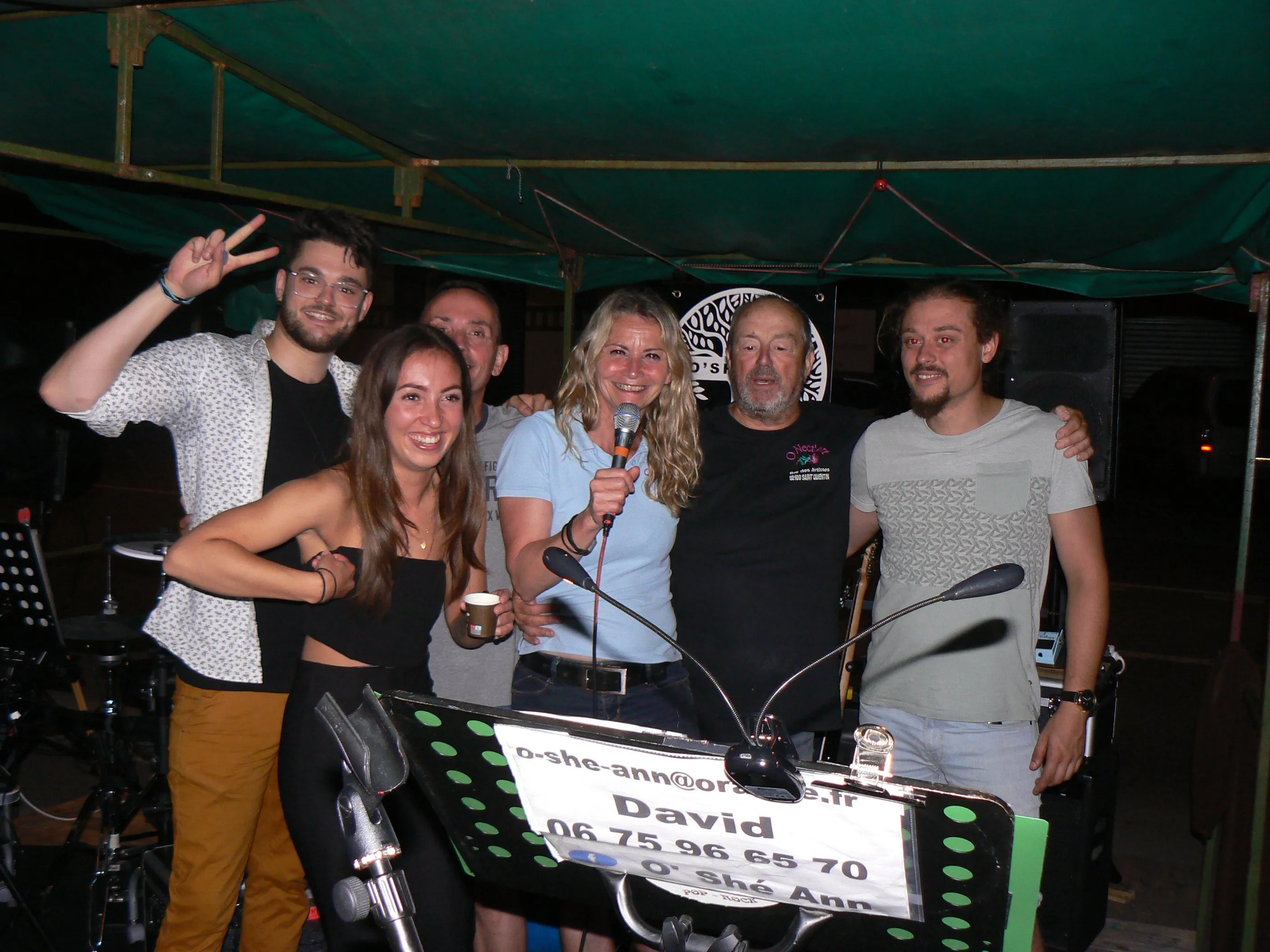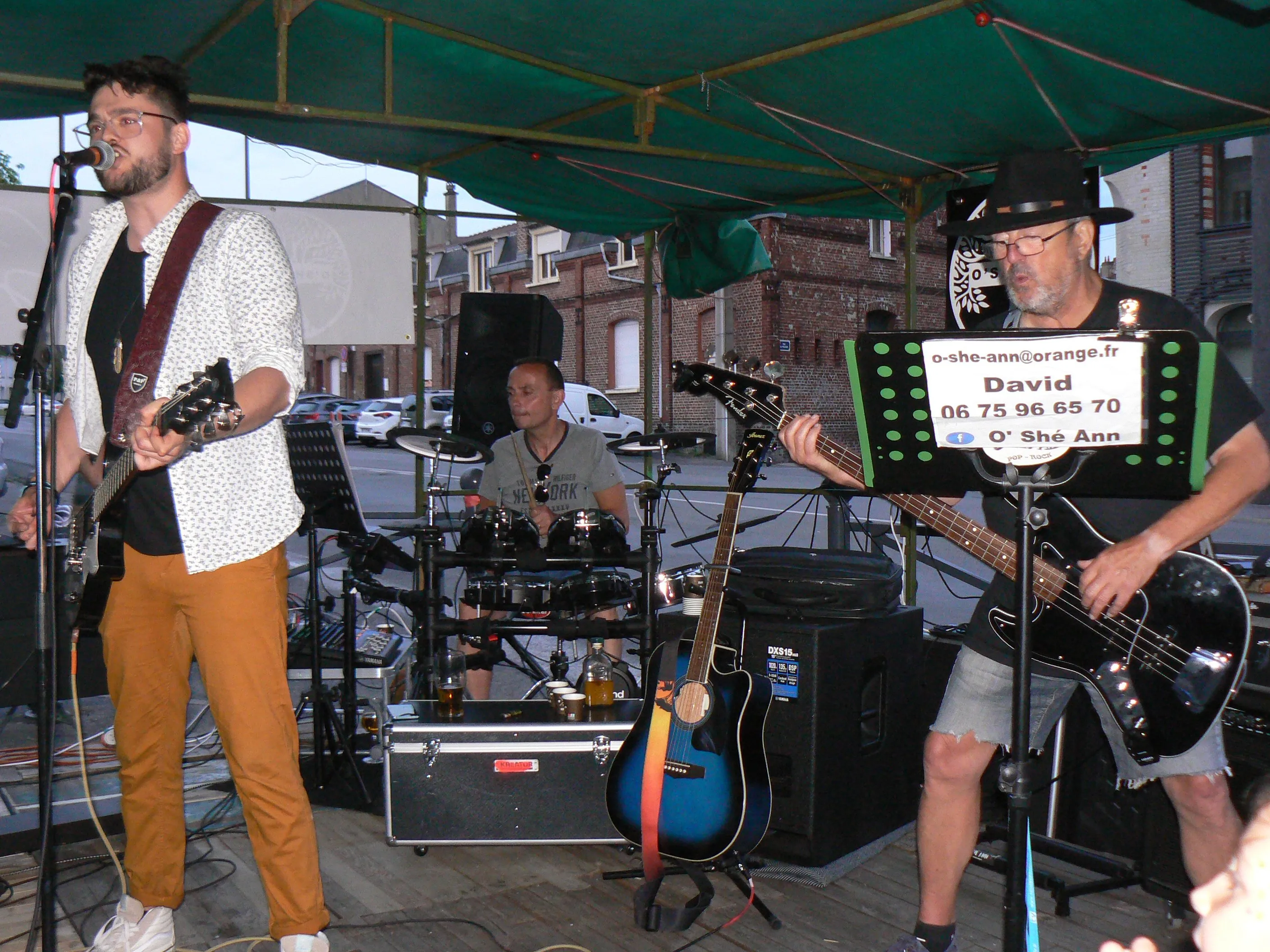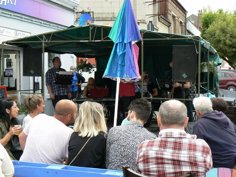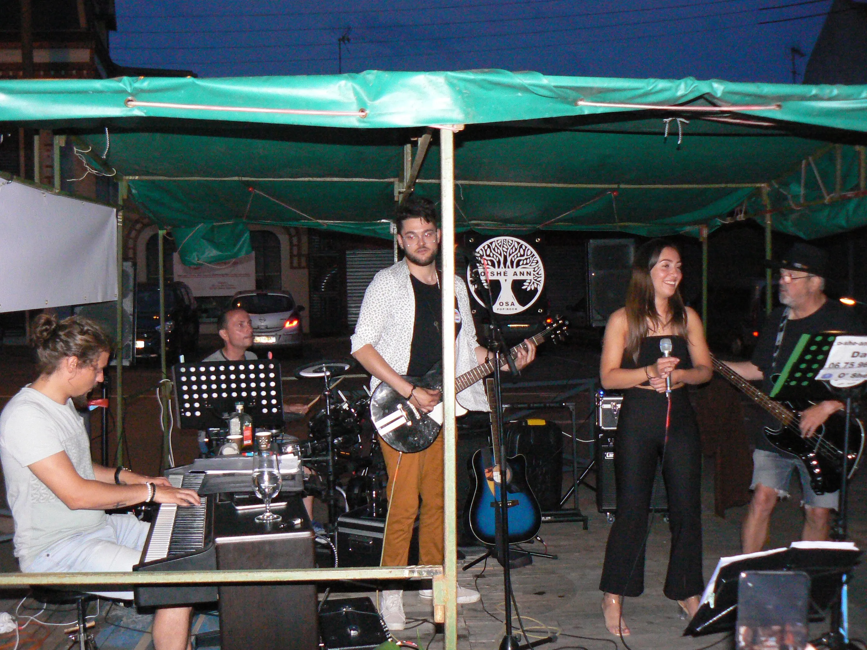 Le public cherche à se mettre à l’abri où il peut : qui dans la salle des fêtes, qui sous les barnums, y compris celui qui abrite le groupe, et c’est « serrés comme des sardines » que les musiciens terminent le concert dans une ambiance survoltée sur des airs de AC/DC ou encore de Jean Louis AUBERT.