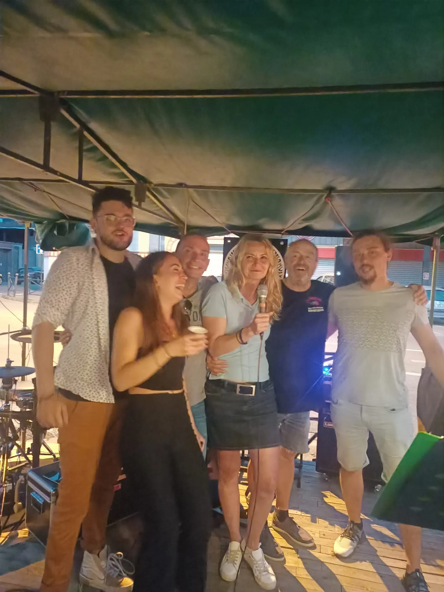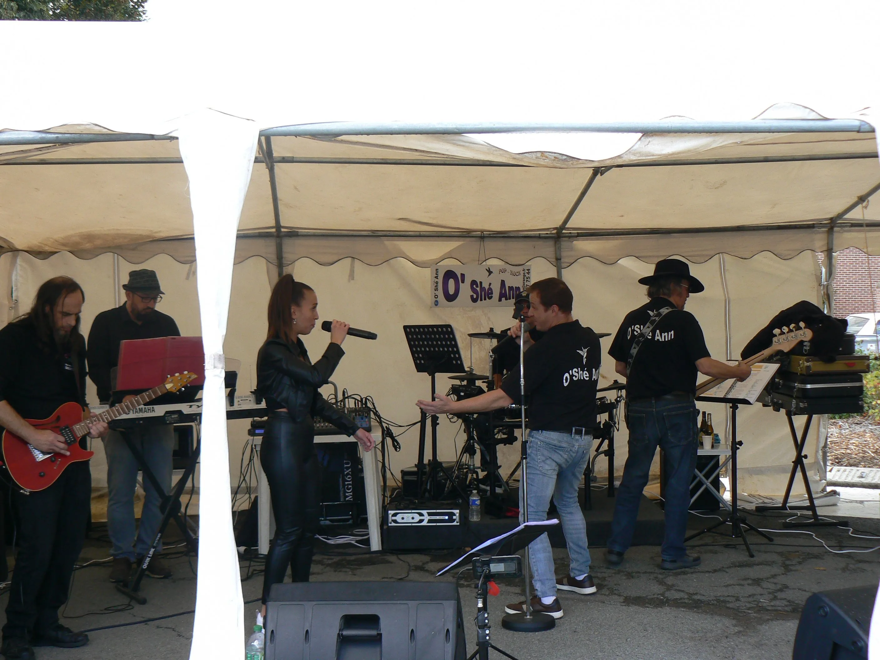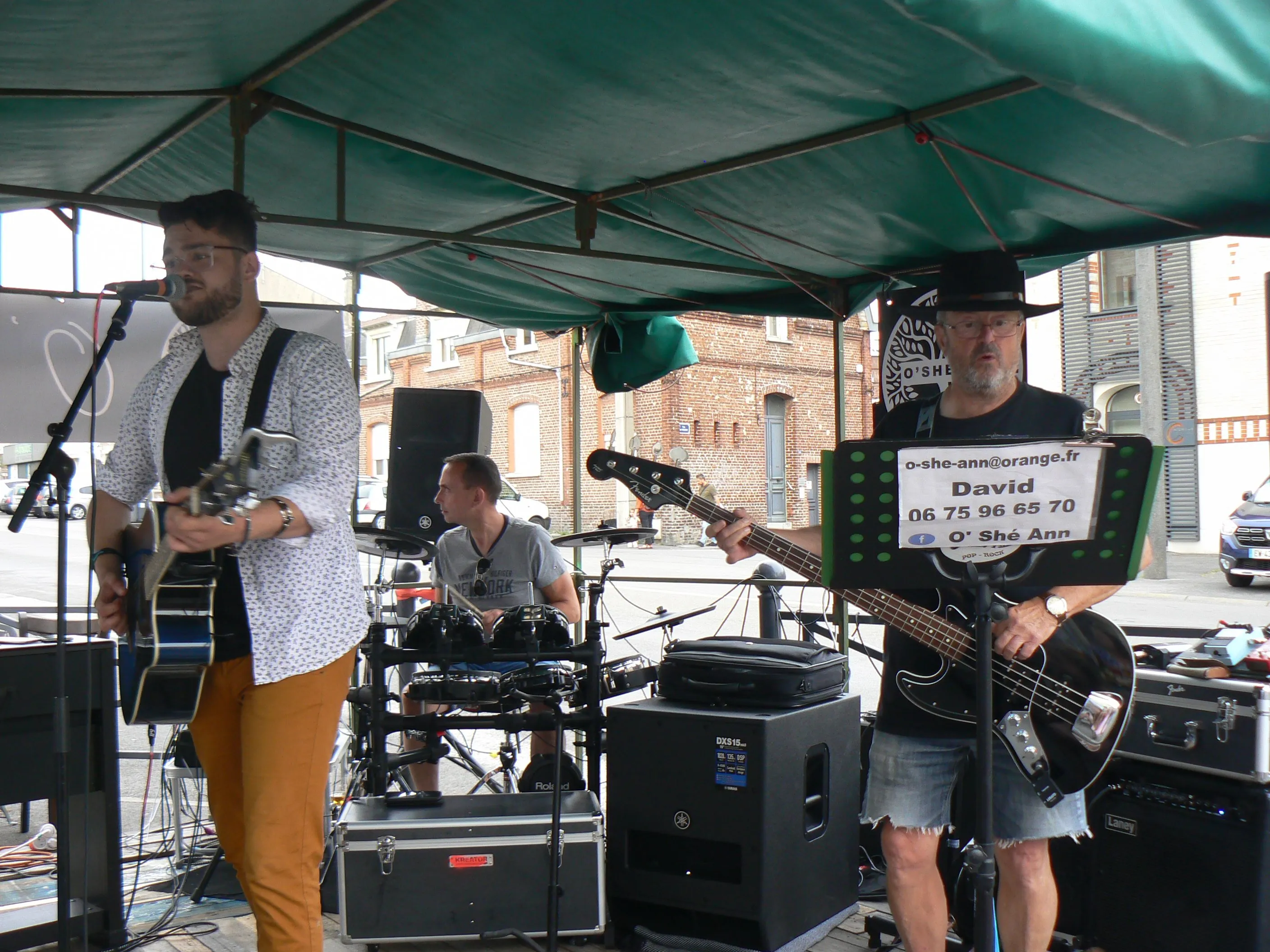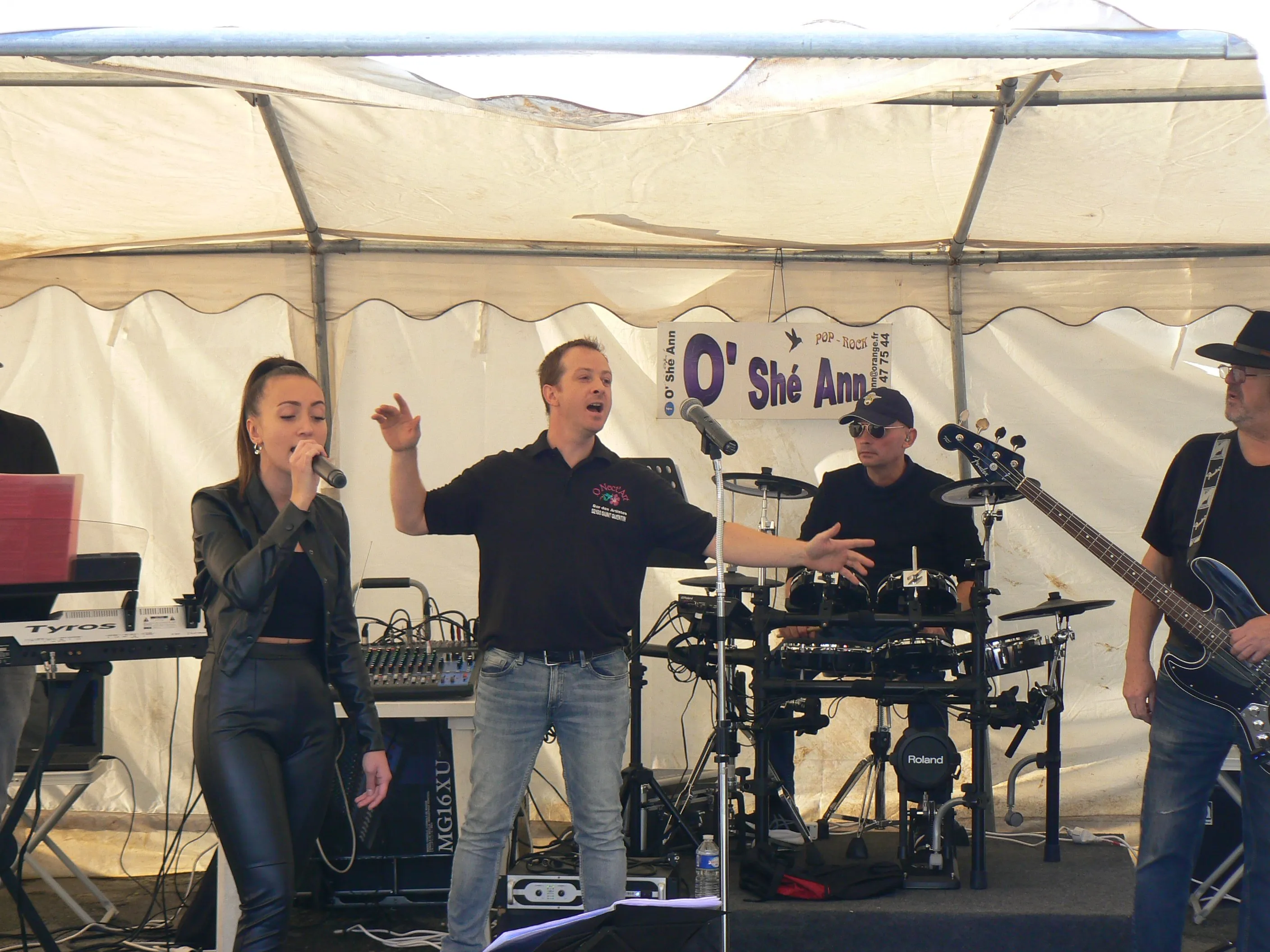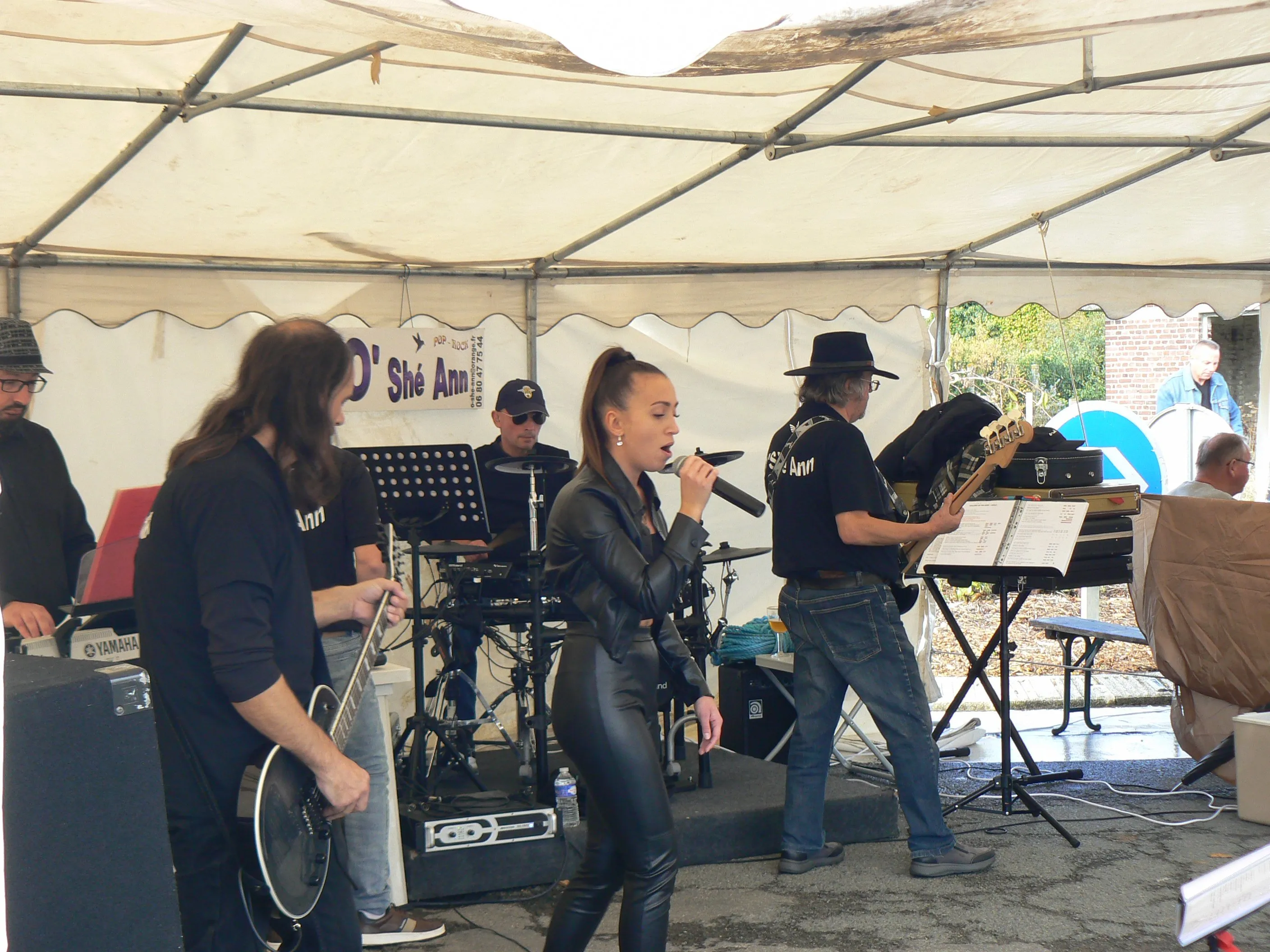 Le public cherche à se mettre à l’abri où il peut : qui dans la salle des fêtes, qui sous les barnums, y compris celui qui abrite le groupe, et c’est « serrés comme des sardines » que les musiciens terminent le concert dans une ambiance survoltée sur des airs de AC/DC ou encore de Jean Louis AUBERT.