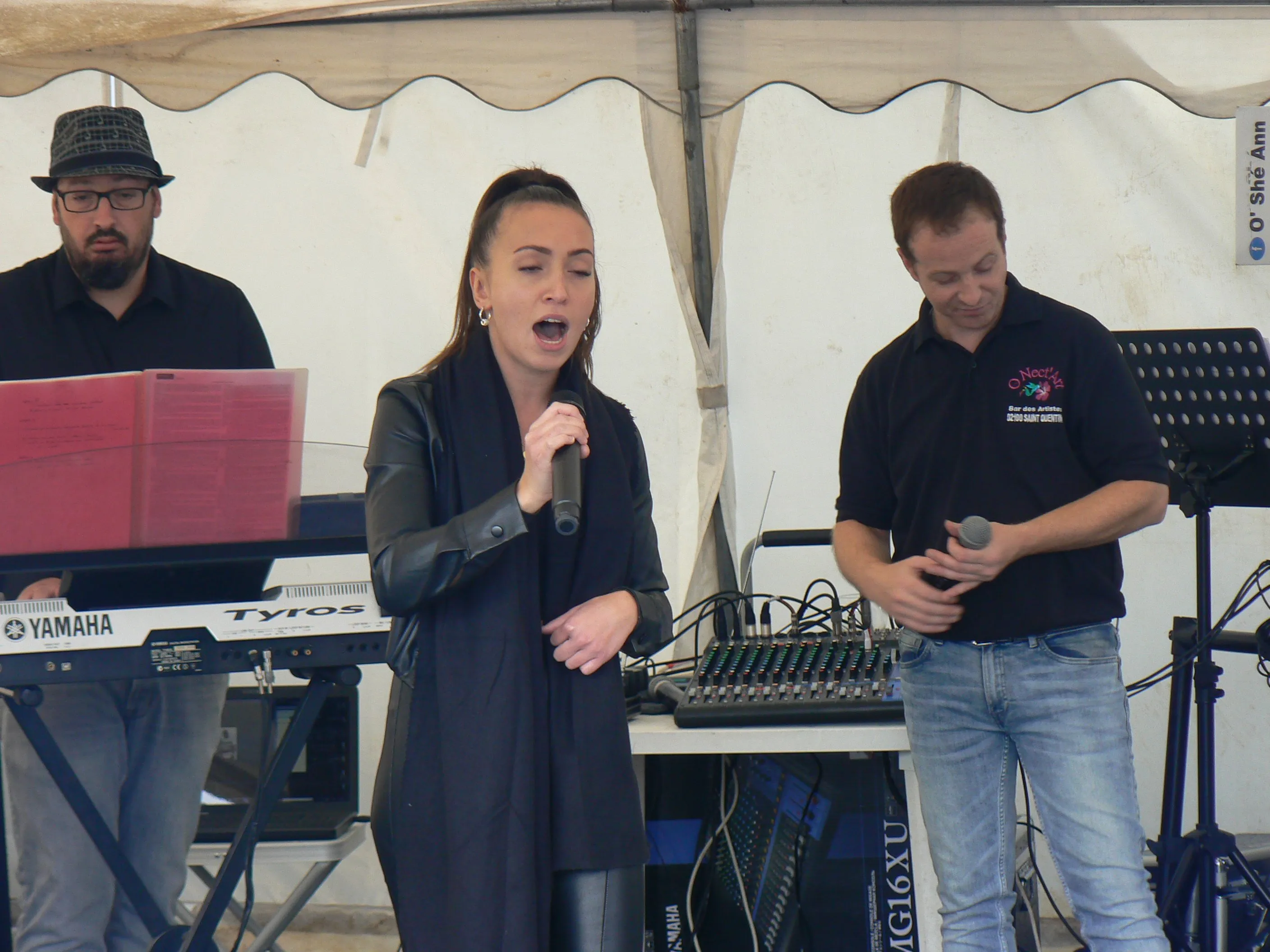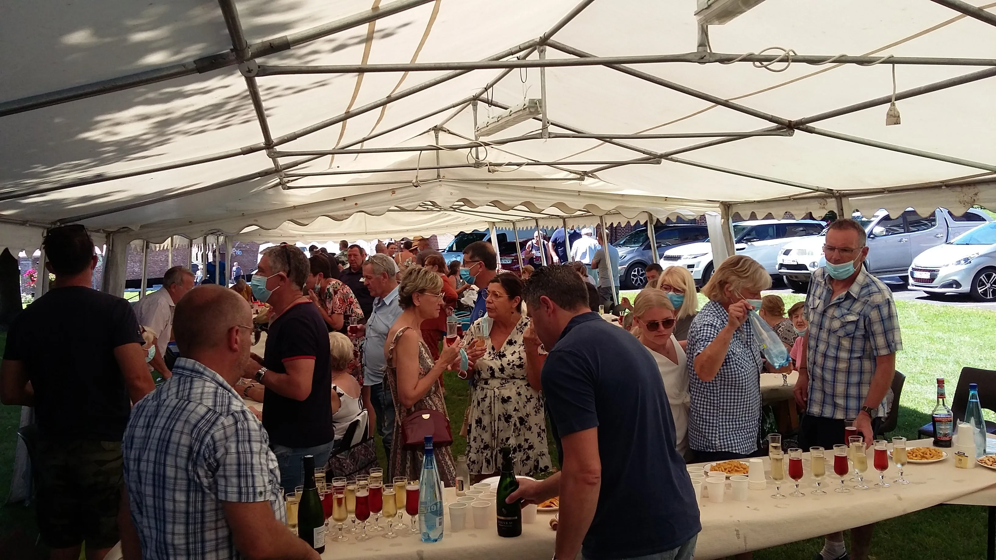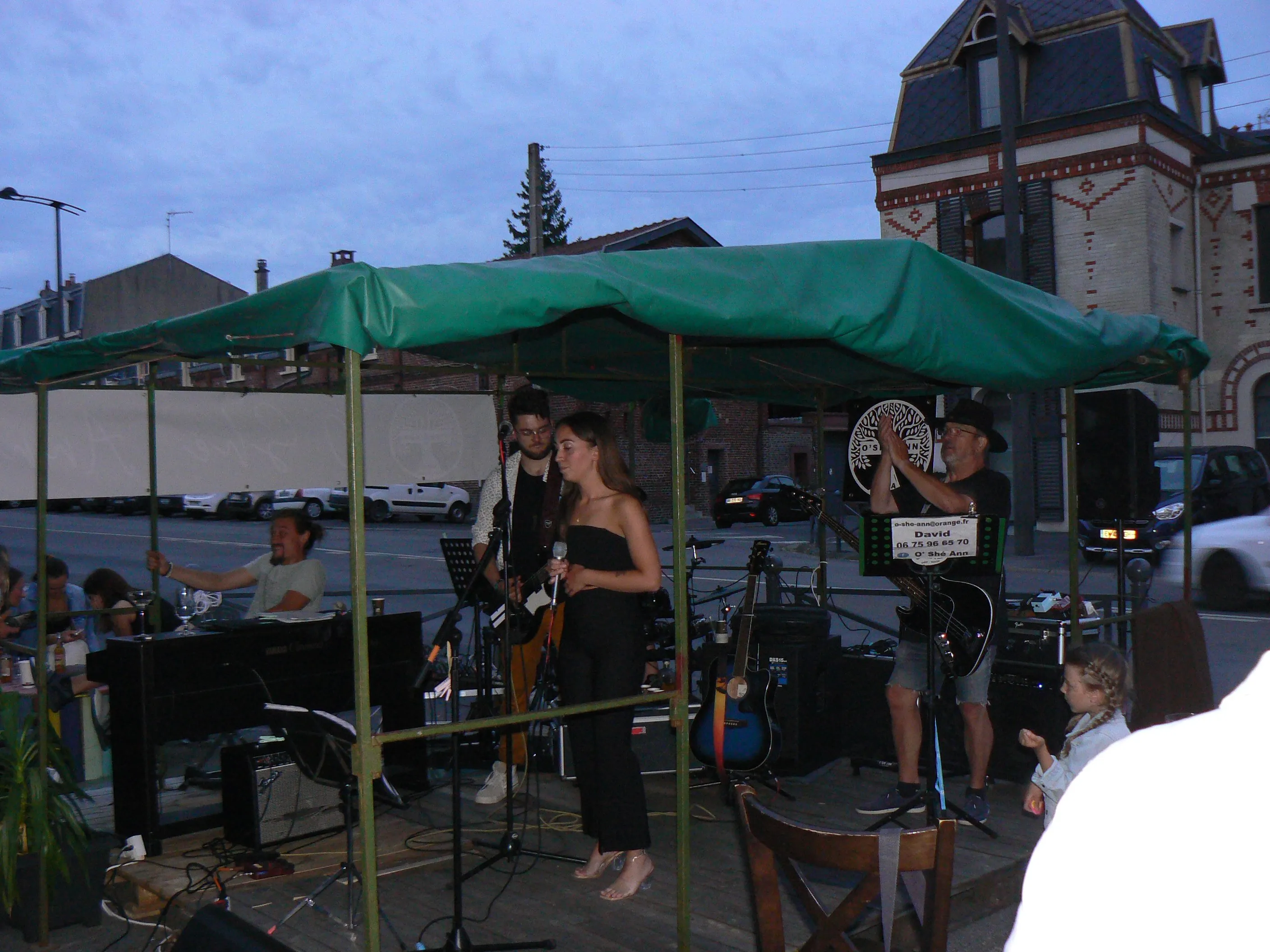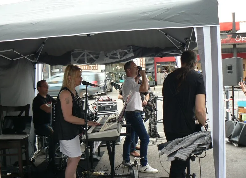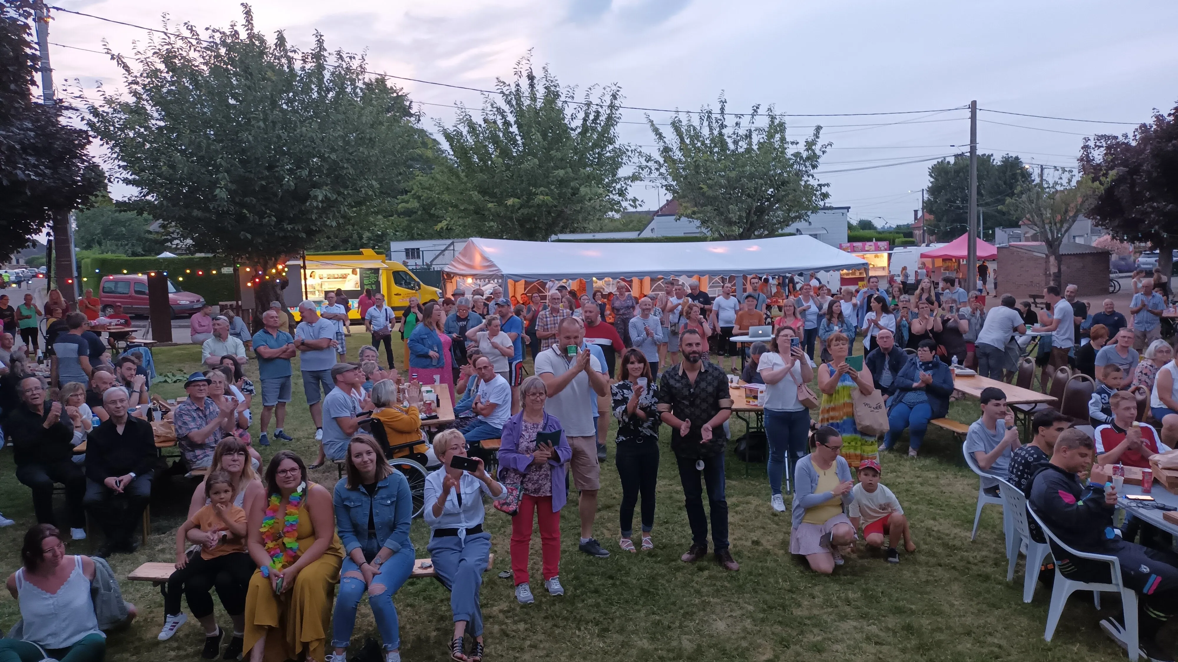Le public cherche à se mettre à l’abri où il peut : qui dans la salle des fêtes, qui sous les barnums, y compris celui qui abrite le groupe, et c’est « serrés comme des sardines » que les musiciens terminent le concert dans une ambiance survoltée sur des airs de AC/DC ou encore de Jean Louis AUBERT.