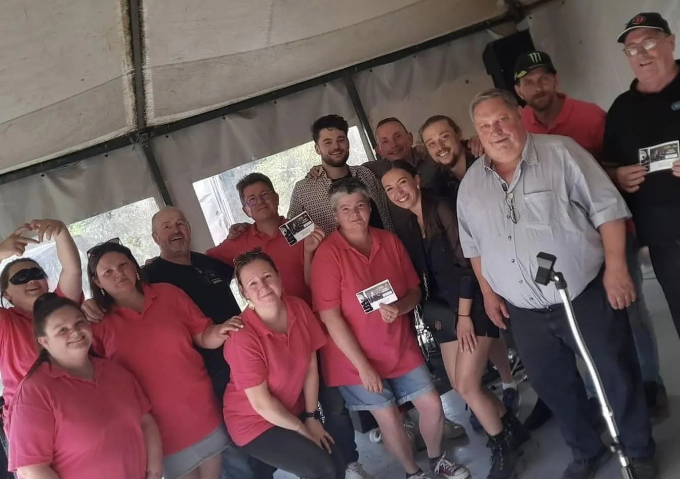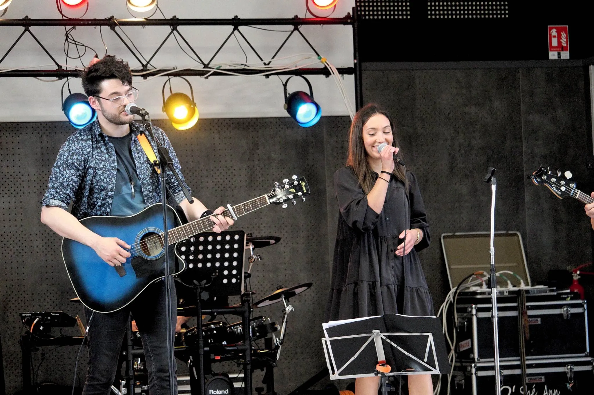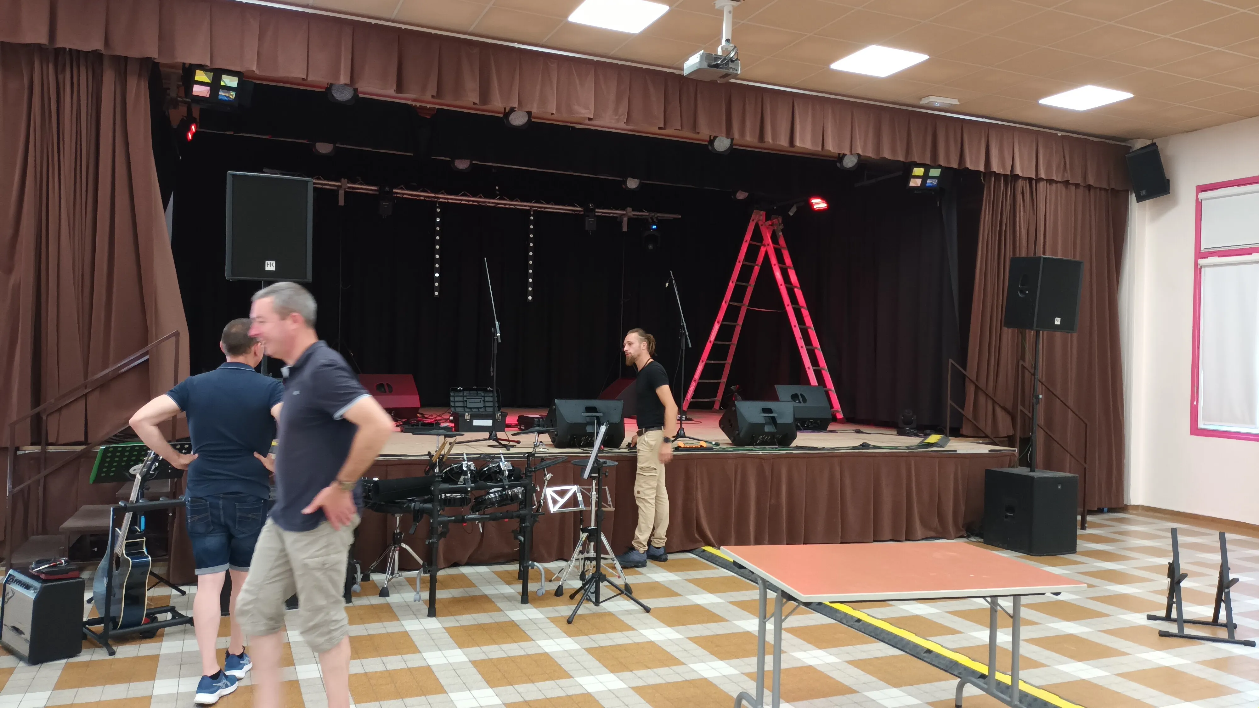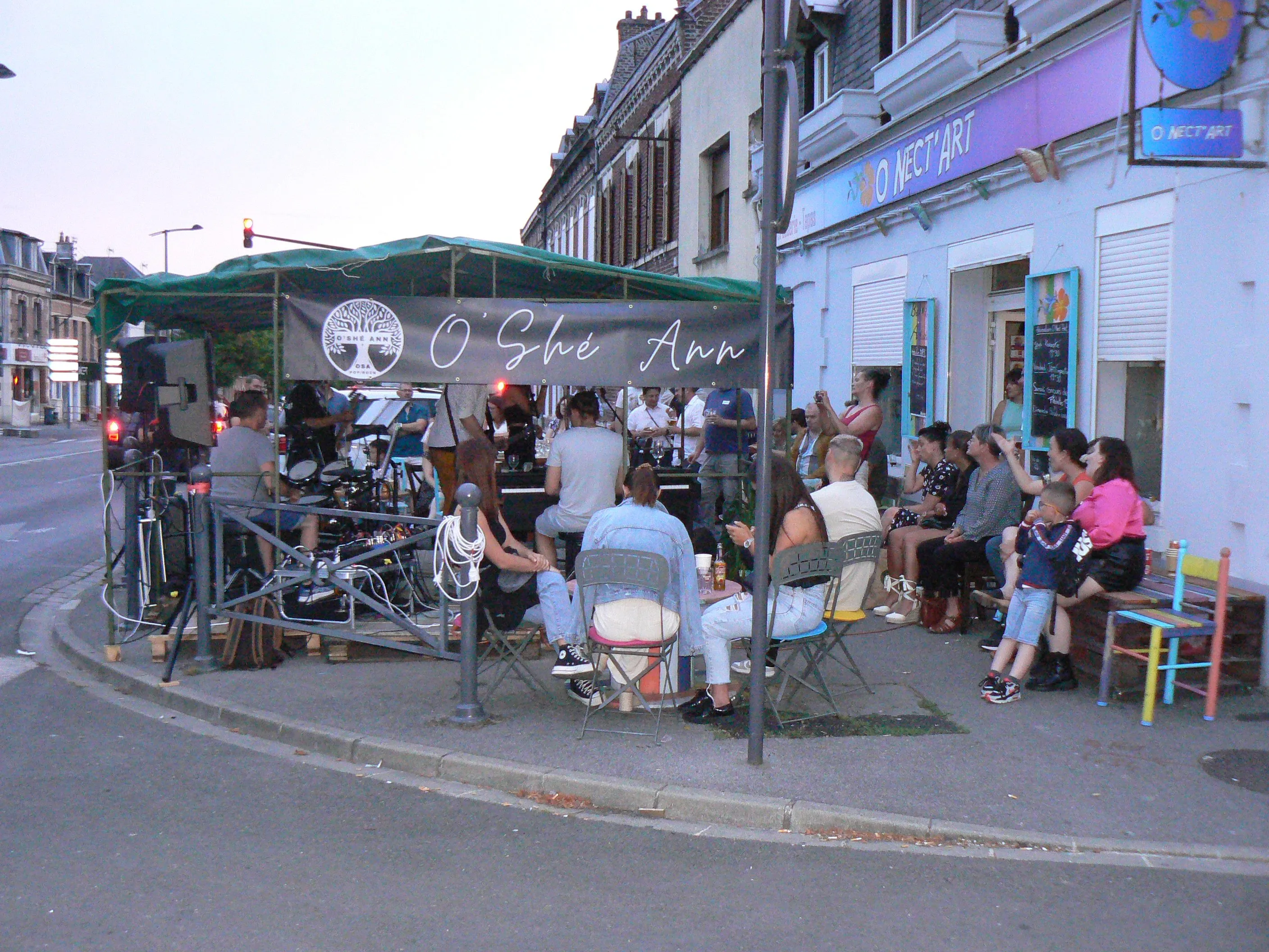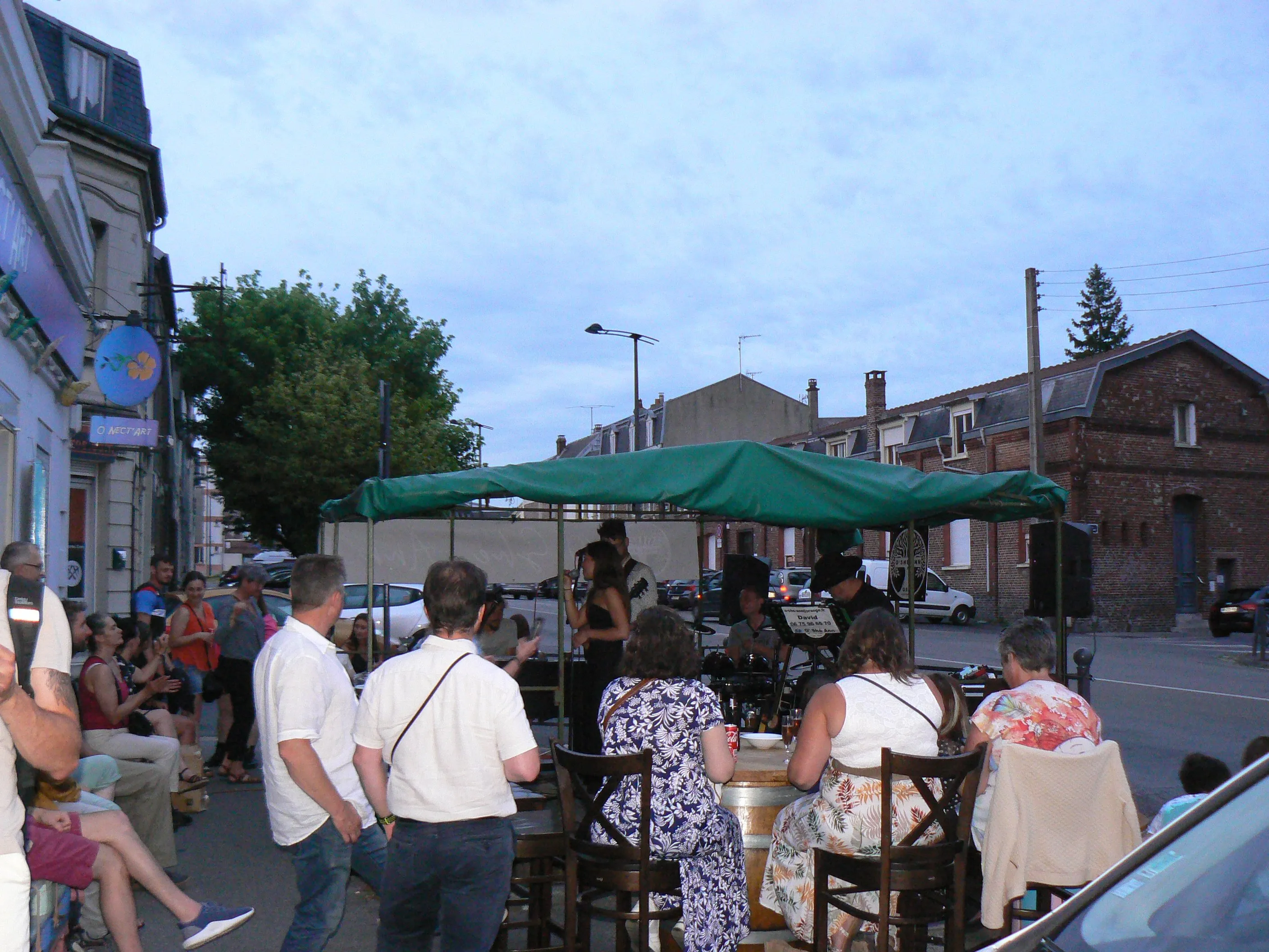 Le public cherche à se mettre à l’abri où il peut : qui dans la salle des fêtes, qui sous les barnums, y compris celui qui abrite le groupe, et c’est « serrés comme des sardines » que les musiciens terminent le concert dans une ambiance survoltée sur des airs de AC/DC ou encore de Jean Louis AUBERT.