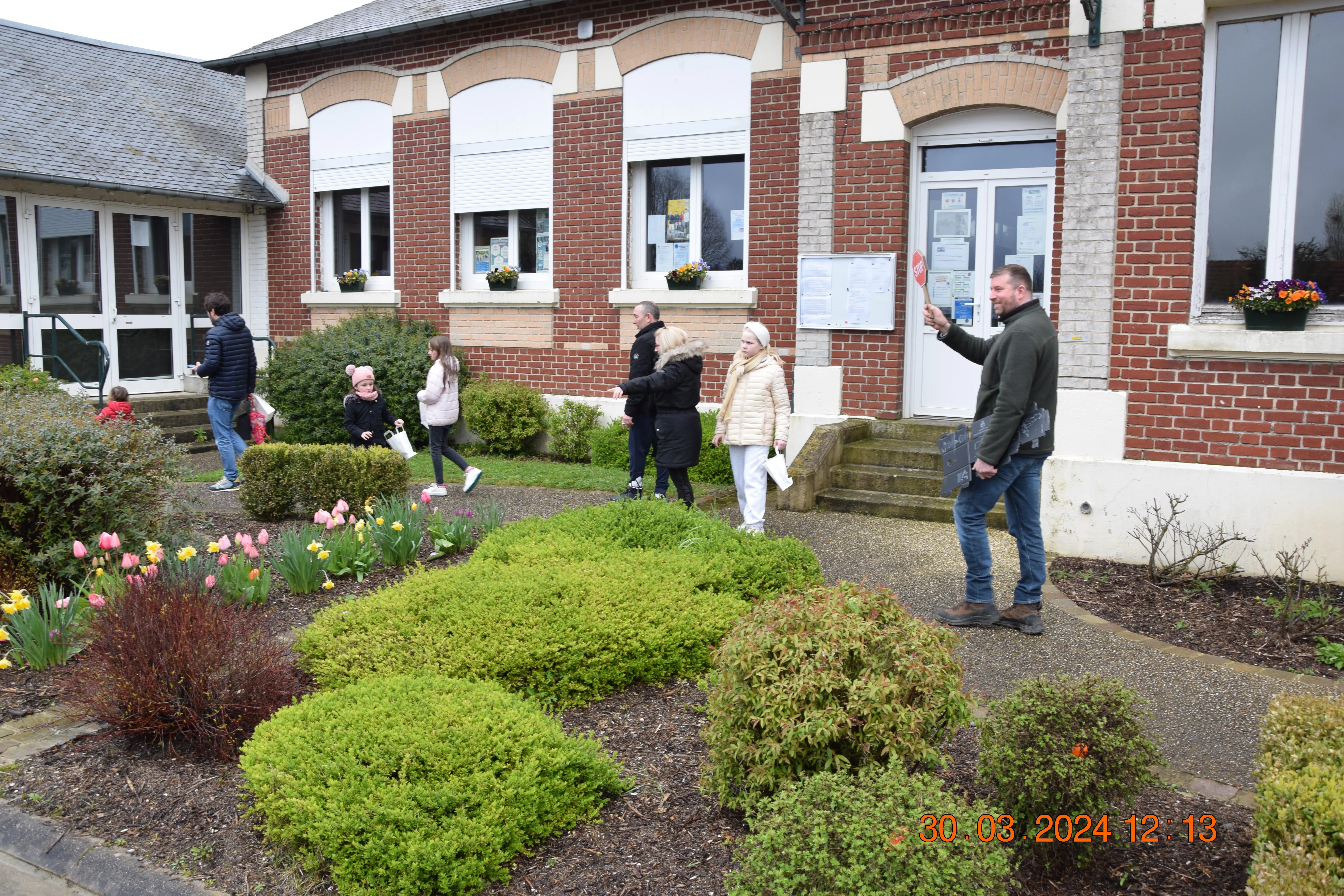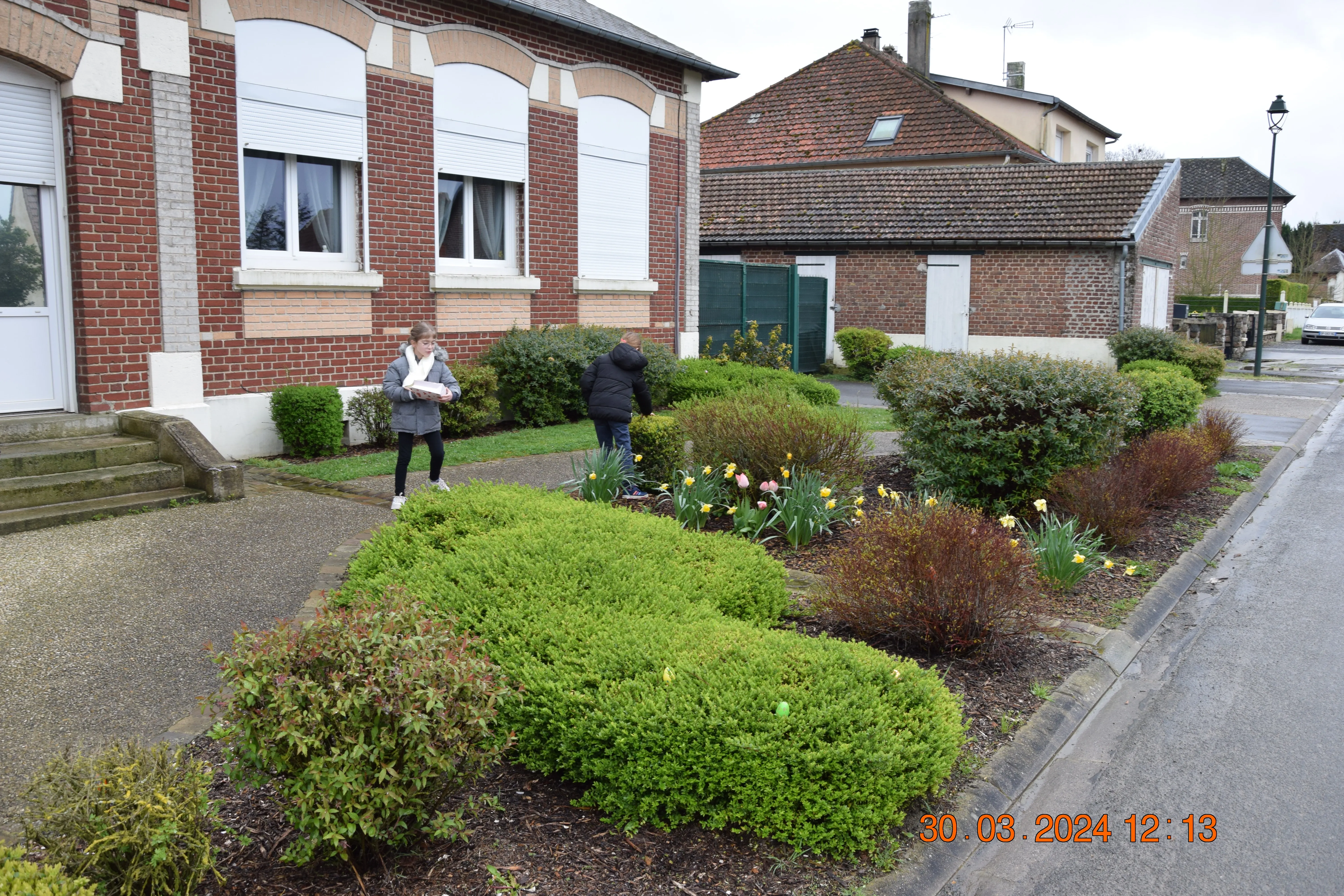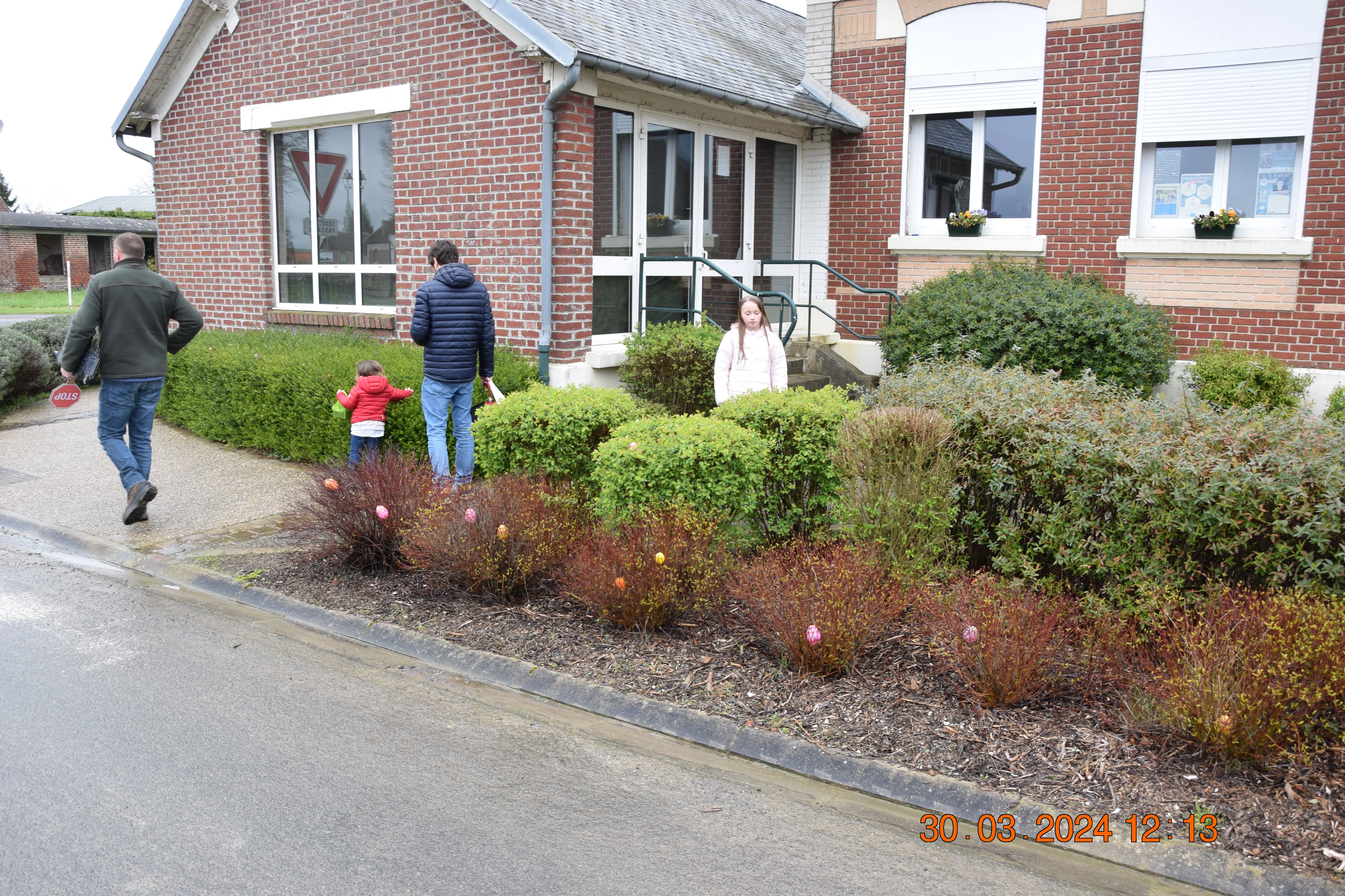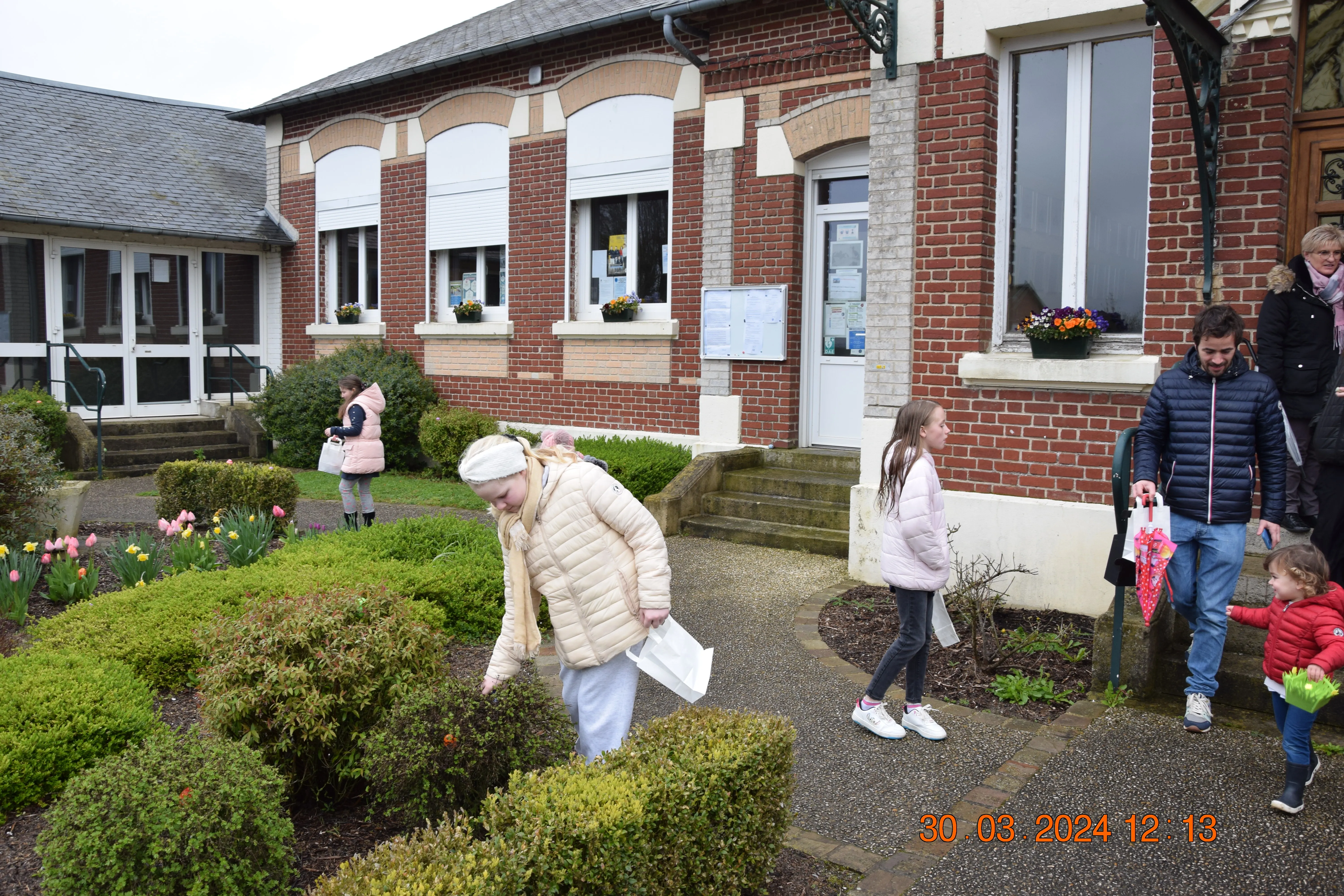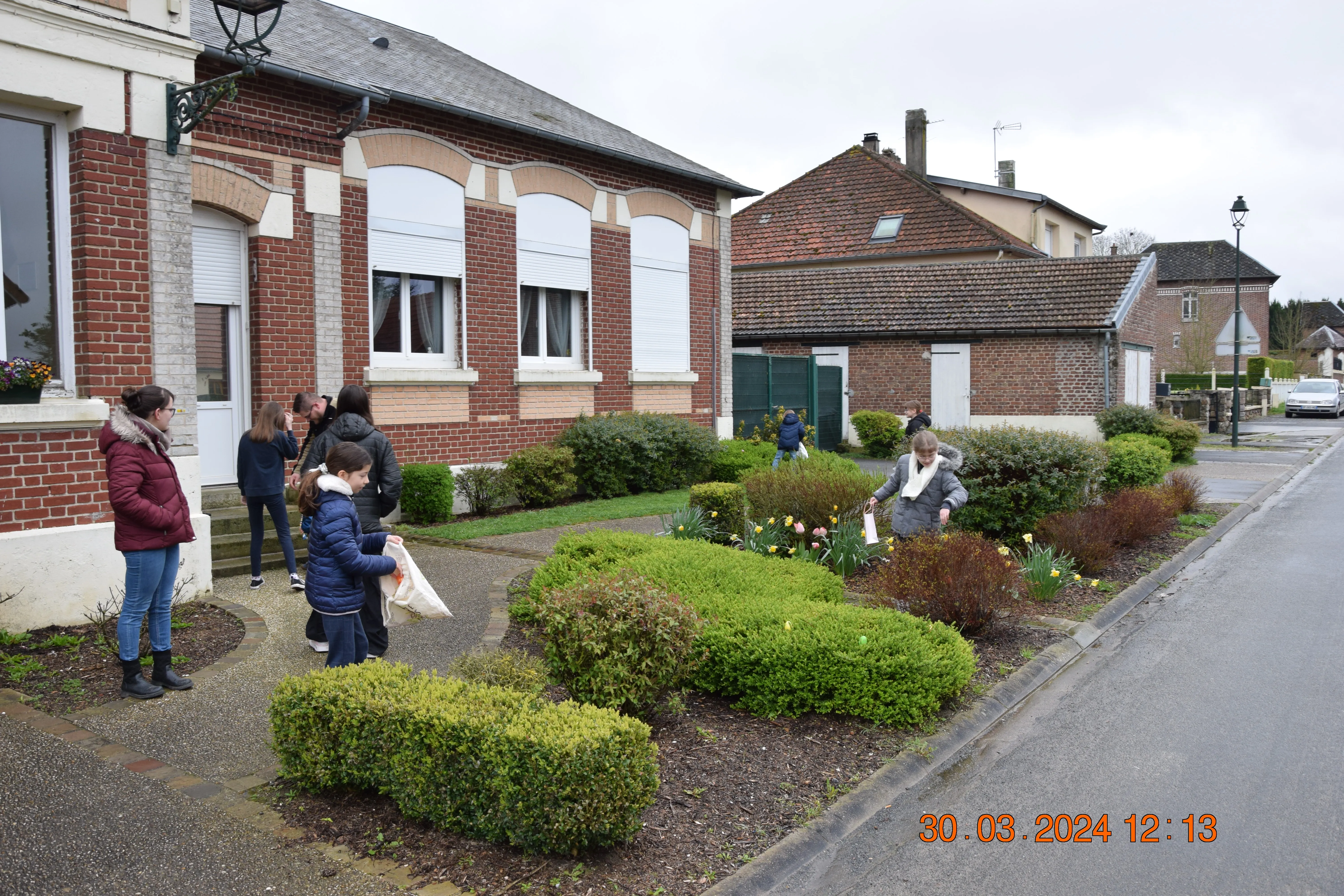 Le temps était clément et la dizaine d'enfants présents pour se mettre à la recherche des œufs se sont bien amusés à fouiller, courir , sur le terrain de football vérifier dans les bosquets afin de ramasser le plus possible d'œufs qu'ils mettaient en commun dans le grand panier de Karine. Une fois que le panier rempli, la distribution se faisait à la salle de la Mairie avec une petite collation.